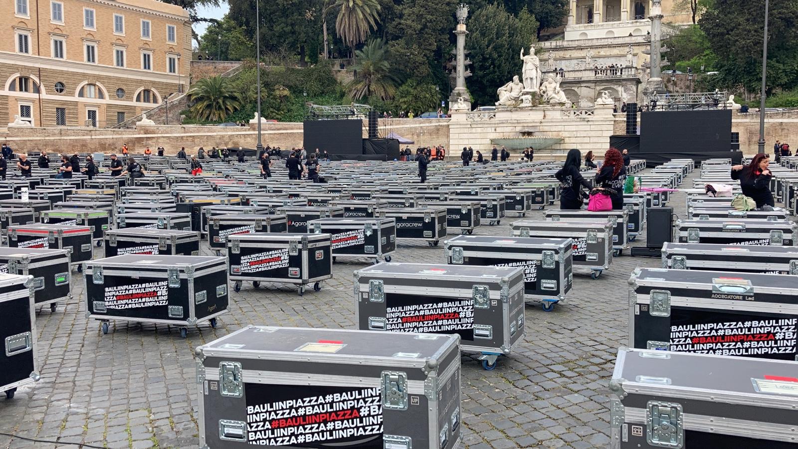 La seconda manifestazione nazionale oggi in Piazza del Popolo a Roma. Dopo il Duomo di Milano, questa volta è stata la volta di piazza del popolo a Roma, la piazza ai piedi del Pincio ad essere invasa da un esercito di bauli, oggetto-simbolo dei lavoratori dietro le quinte, e da migliaia di operatori che manifesteranno nel rispetto delle norme anti covid.