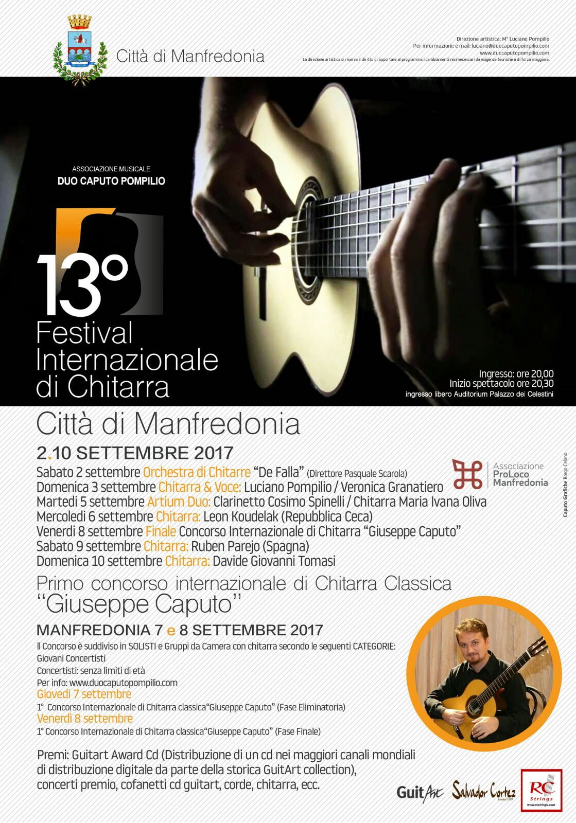 Belle ed emozionante novità di questa edizione sarà lo svolgersi all’interno del Festival del I Concorso Internazionale di Chitarra “Giuseppe Caputo”, fortemente voluto e organizzato dall’Associazione Musicale Duo Caputo Pompilio di San Giovanni Rotondo per rendere omaggio all’amico e collega prematuramente scomparso il 18 aprile 2016. Il concorso, che ha come finalità la promozione del repertorio chitarristico tra i giovani studenti, si svolgerà il 7 e 8 settembre. Al vincitore verrà assegnato il Guitart Award Cd.