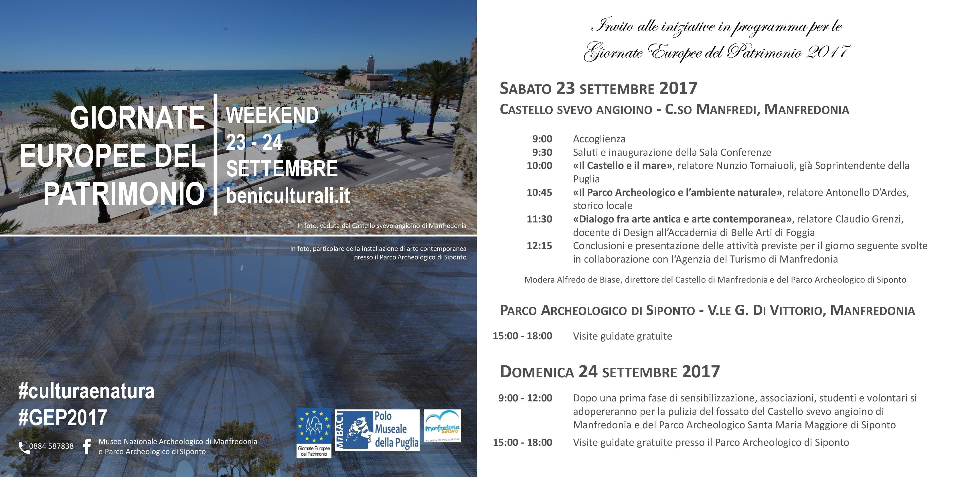 organizzate in collaborazione con l’Agenzia del Turismo e con il Comune di Manfredonia. Sarà possibile seguire le Giornate Europee del Patrimonio 2017 anche sui social con gli hashtag #GEP2017, #culturaenatura, #culturaèpartecipazione o sul sito internet beniculturali.it