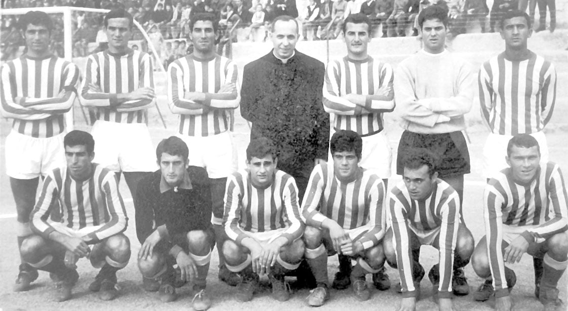 Didascalia foto: In piedi da sinistra: Ciociola Renzino, Tarallo, Cisternino, Don Andrea Papagno, Spocchi, Maurini, Mario Guerra. In basso da sin.: Belluna, Mondelli, Totaro Gaetano, Zandri, Conti, Scappi. Collezione Archivio Storico Sipontino – Foto Renato.