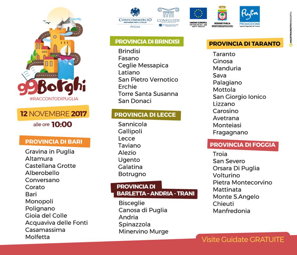 Riscoprire i borghi della Puglia spesso turisticamente dimenticati ma ricchi di storie e tradizioni. E’ questo l’obiettivo che Confcommercio Puglia si propone con il progetto “99 Borghi – #raccontodiPuglia” in collaborazione con Confguide Puglia, Regione Puglia e Pugliapromozione.