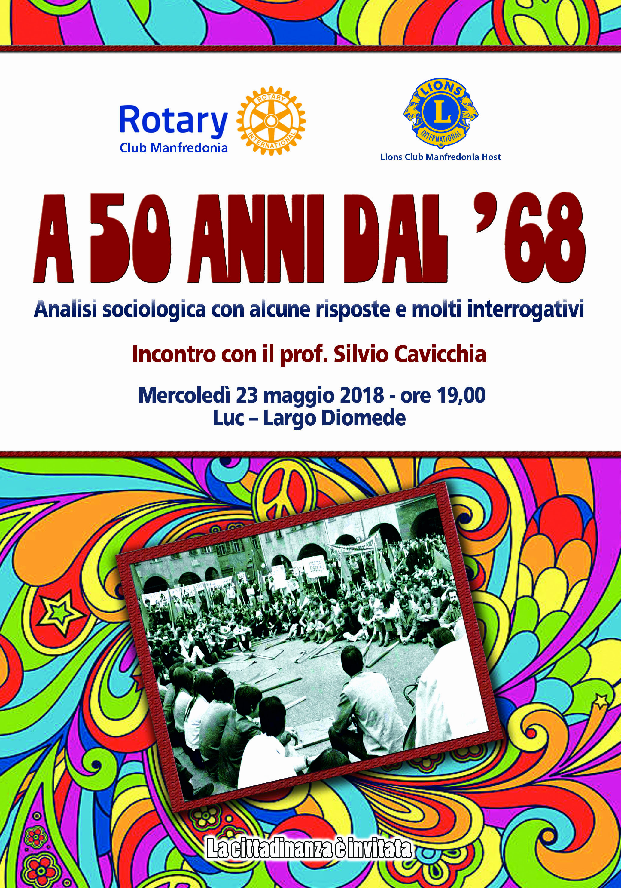 Quando si parla del 68, l’anno della contestazione giovanile, si aprono una serie di scenari che sollevano il classico degli interrogativi “Fu vera gloria?”, si è trattato davvero di un momento che ha cancellato quanto sapeva di passatismo e aperto infiniti spiragli verso l’emancipazione globale della società giovanile del tempo e di quelle che poi l’avrebbero seguita negli anni? Oppure ha avuto un effetto boomerang, frantumando il grande fiume iniziale in una serie di torrenti e rigagnoli dai corsi imprevedibili e, a volte, straripanti? I mille interrogativi che apre questo straordinario momento della nostra storia recente saranno oggetto dell’incontro, organizzato mercoledì, 23 maggio, dal Rotary Club Manfredonia e dal Lions Club Manfredonia Host sul tema “A 50 anni dal ’68- Analisi sociologica con alcune risposte e tanti perché”. Illustre relatore il prof. Silvio Cavicchia, sociologo, che, in chiave di protagonista e interprete di quel “mitico” momento, dunque, attraverso il suo vissuto personale e gli studi condotti, offrirà uno spaccato degli anni che hanno cambiato, comunque, il modo di concepire la realtà sociale. L’incontro, rivolgendosi a tutta la cittadinanza, ha come interlocutori privilegiati i più giovani, per una riflessione generazionale ed un confronto più ampi e pregnanti. Appuntamento al LUC, Mercoledì 23 maggio, alle ore 19.00 per una suggestiva e coinvolgente riflessione.
