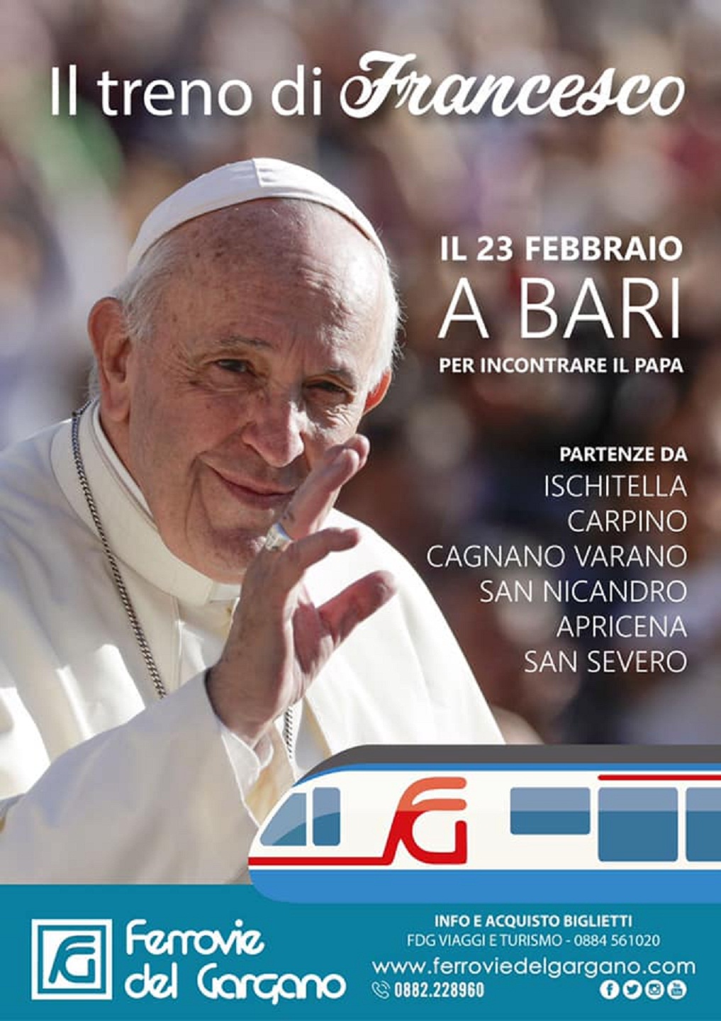 Papa Francesco sarà a Bari il prossimo 23 febbraio per la chiusura dell’incontro dei vescovi del Mediterraneo e per l’occasione Ferrovie del Gargano organizza treni straordinari per dare la possibilità alle comunità del Gargano Nord, Apricen e S.Severo di partecipare all’incontro con il Santo Pontefice. Il “Treno di Francesco” partirà da Ischitella, Carpino, Cagnano Varano, San Nicandro Garganico, Apricena e S.Severo.