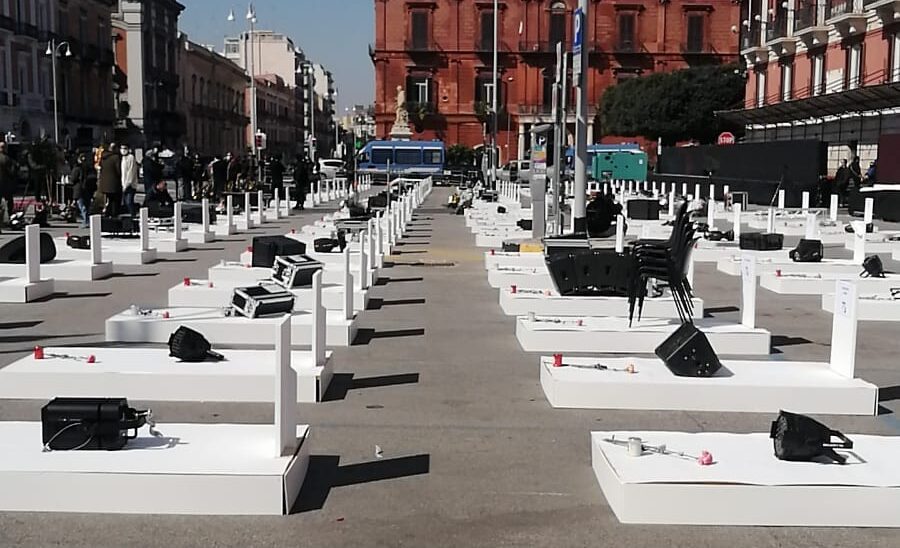 Oggi davanti palazzo prefettura a Bari si è svolta la protesta dei lavoratori dello spettacolo. Una Categoria che purtroppo è tra le più devastate dalla pandemia. Oltre un anno di fermo assoluto e senza gli adeguati sostegni. La situazione è critica tanto che gli operatori del settori oggi a Bari hanno creato un vero e proprio cimitero con gli strumenti da lavoro, proprio per far comprendere alle istituzioni che questo settore è moribondo ed in fortissima difficoltà.