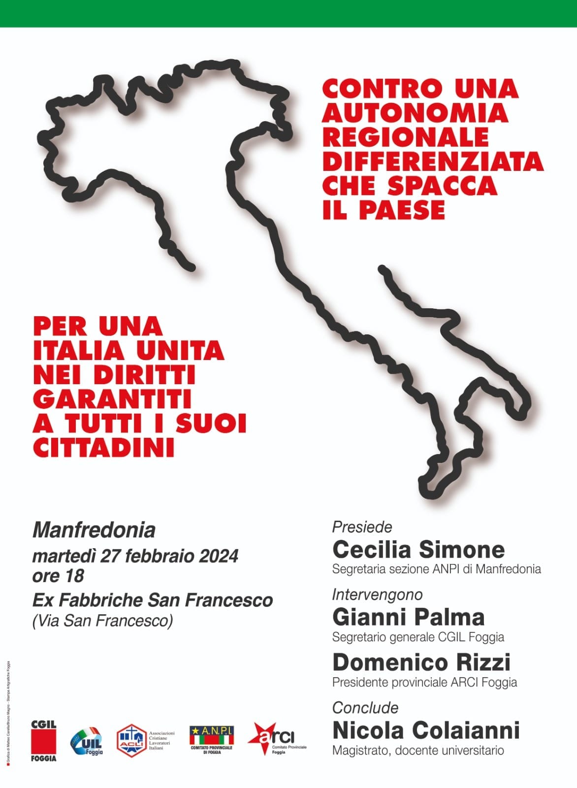 Una iniziativa che nasce dalla sinergia tra la nuova Sezione Anpi di Manfredonia e il Coordinamento provinciale cui hanno aderito molte associazioni tra cui l’Anpi provinciale, l’Arci, le Acli, oltre ai sindacati provinciali Cgil e Uil e alle forze politiche che stanno conducendo in Parlamento la battaglia per contrastare il provvedimento – fortemente voluto dal leghista Calderoli – e che il prof. Gianfranco Viesti ha definito senza mezzi termini “la secessione dei ricchi”.