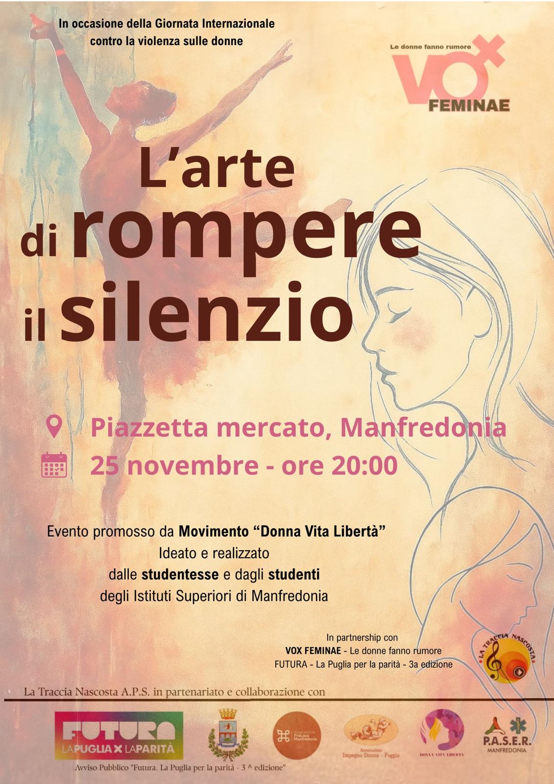 Manfredonia, 25 novembre 2025 – In occasione della Giornata Internazionale per l’eliminazione della violenza contro le donne, le scuole superiori di Manfredonia si uniscono per dare vita all’evento “L’arte di rompere il silenzio”, promosso dagli studenti della città. L’iniziativa è realizzata in collaborazione con il Movimento Donna, Vita, Libertà, e si inserisce nel programma della terza edizione di Futura – La Puglia per la parità, in partnership con Vox Feminae – Le donne fanno rumore.