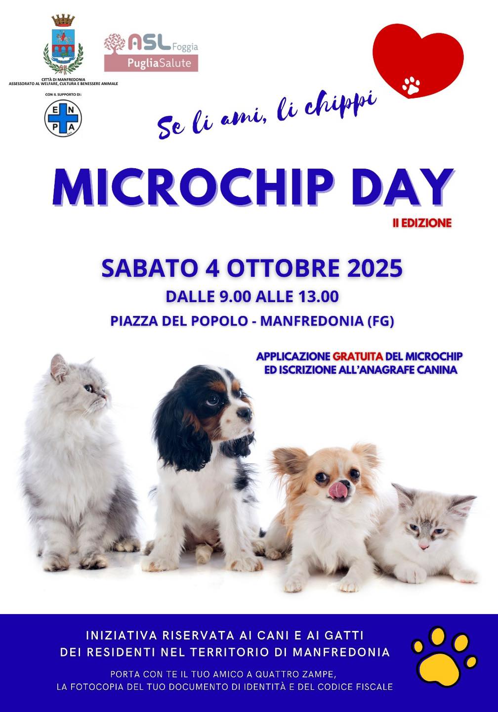 L’iniziativa è riservata ai cani e ai gatti dei residenti nel territorio di Manfredonia. Porta con te il tuo amico a quattro zampe, la fotocopia del tuo documento di identità e del codice fiscale. Il “Microchip Day” rappresenta un passo importante per consolidare il legame tra cittadini e animali, rafforzando l’impegno dell’Amministrazione per un futuro più responsabile e rispettoso.