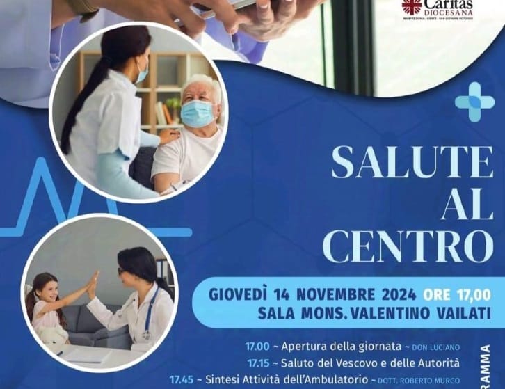 Giovedì 14 Novembre alle ore 17.00 presso la Sala “Mons. Vailati” in Manfredonia si terrà un convegno con il tema “Salute al Centro” a cura della Caritas diocesana, in cui sarà illustrato l’attività dell’ambulatorio sociale polispecialistico “Mons. Michele Castoro”, presso Casa della Carità, con interessanti interventi sulla prevenzione di alcuni dei nostri medici specialisti.