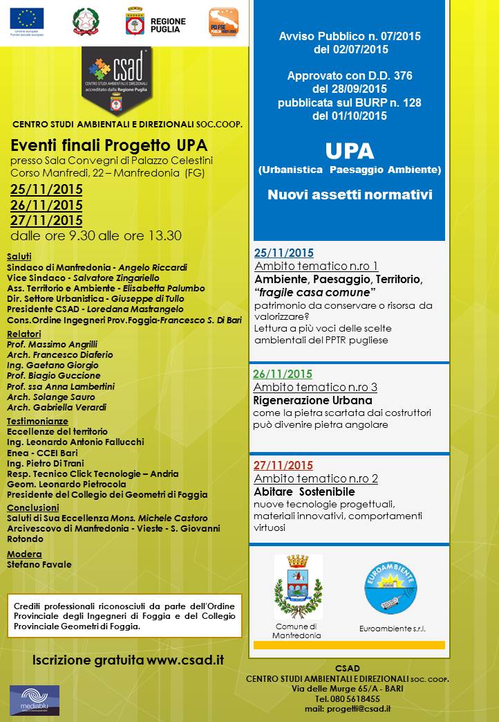 Il Centro Studi Ambientali e Direzionali CSAD di Bari, nell’ambito delle sue numerose attività ha il piacere di annunciare gli eventi conclusivi del Progetto UPA (Urbanistica Paesaggio Ambiente) che si terranno presso la Sala Convegni di Palazzo Celestini in Corso Manfredi 22 a Manfredonia nei giorni 25-26-27 Novembre p.v. dalle ore 9,30 alle 13,30 con il gentile patrocinio del Comune di Manfredonia.