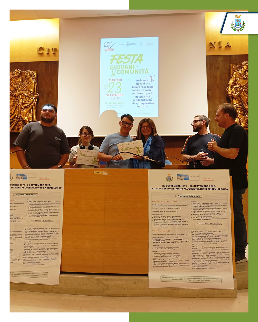 Il 23 settembre nel Chiostro della Casa Comunale si è svolta la Festa Giovani e Comunità, evento conclusivo del progetto “Si può fare in sicurezza – Manfredonia”, finanziato dal Fondo Unico Giustizia del Ministero dell’Interno e promosso dal Comune di Manfredonia con il supporto di Cantiere Giovani.