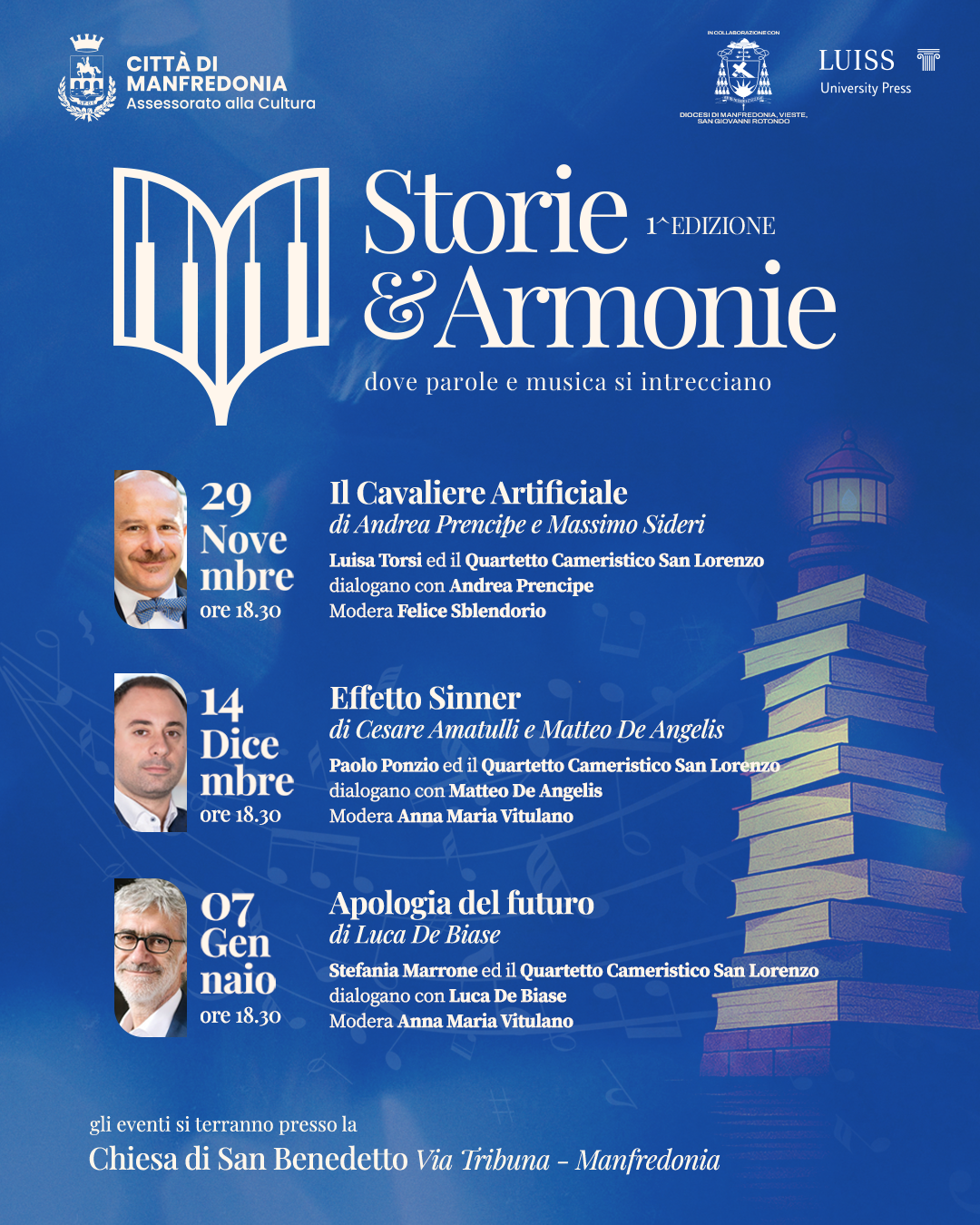 Il primo incontro di sabato 29 novembre, alle ore 18.30, vedrà protagonista Andrea Prencipe con il suo saggio Il Cavaliere Artificiale, in dialogo con Luisa Torsi, professoressa ordinaria di Chimica all’Università degli Studi di Bari Aldo Moro e membro dell’Accademia dei Lincei, accompagnati dal Quartetto Cameristico San Lorenzo e con la moderazione del giornalista Felice Sblendorio. Un confronto più che mai urgente sul rapporto tra uomo, tecnologia e responsabilità etiche, arricchito da un contrappunto musicale capace di restituire umanità a un dibattito spesso dominato da algoritmi e astrazioni.