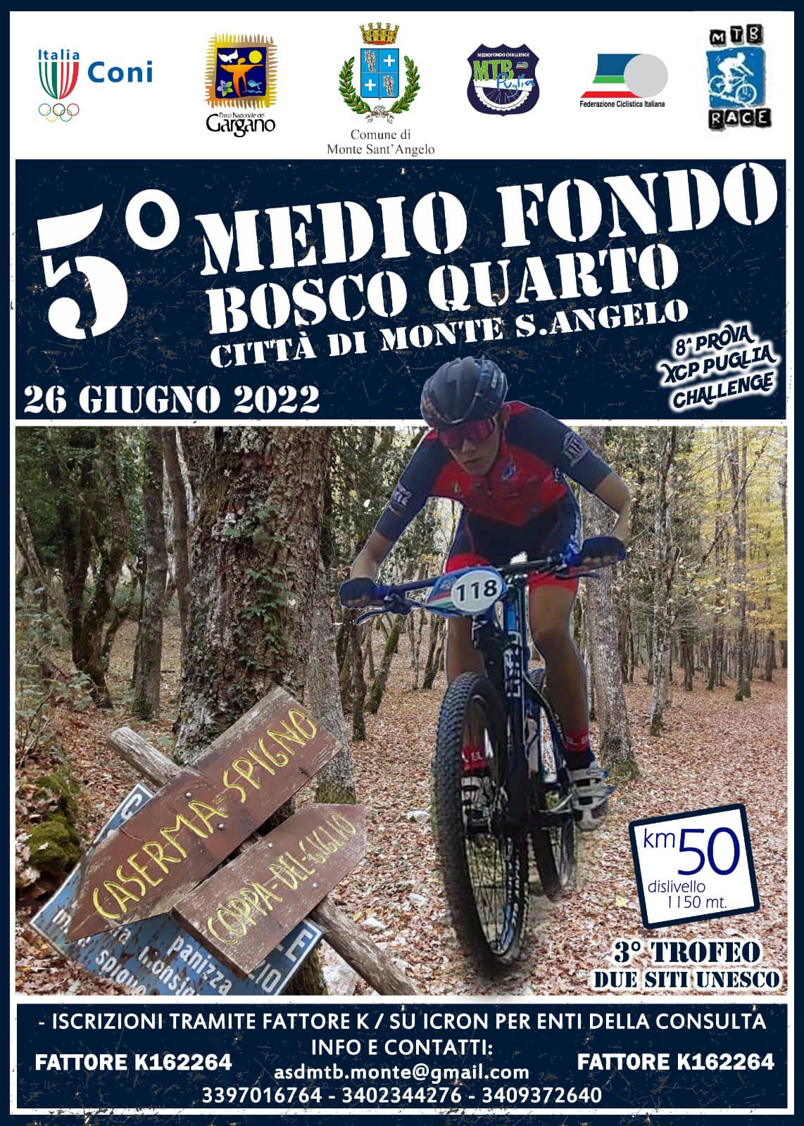 Percorso veloce, scorrevole e suggestivo sulla distanza di 50 chilometri circa con dislivello di 1150 metri quasi interamente su fondo sterrato, in presenza di tratti tecnici non molto impegnativi e con pendenze che in alcuni punti arrivano al 22%. Si attraversano i territori boschivi del Parco Nazionale del Gargano ricadenti nel territorio comunale di Monte Sant’Angelo. Previsti due ristori sul percorso più alcuni punti acqua mobili. Al chilometro 38 è posizionato un gran premio della montagna con l’assegnazione del Trofeo Unesco. Il vincitore assoluto della mediofondo riceverà in palio un telaio in carbonio della Rebel fornito da Cicli Eurobike.