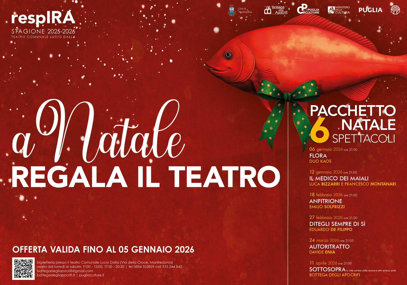 La promozione, attiva dall’11 dicembre 2025 al 5 gennaio 2026, include sei spettacoli della stagione: lo spettacolo internazionale di teatro danza “Flora” del duo Kaos (6 gennaio 2026), “Il medico dei maiali” con Luca Bizzarri e Francesco Montanari (12 gennaio 2026), “Anfitrione” con Emilio Solfrizzi (18 febbraio 2026), una rilettura di “Ditegli sempre di sì” di Eduardo De Filippo per la regia di Domenico Pinelli (27 febbraio 2026), il potente teatro di narrazione del Premio Ubu Davide Enia che racconta con l’orazione civile “Autoritratto” le vicende di Cosa Nostra avvenute in Sicilia e a Palermo fra gli anni Ottanta e Novanta (24 marzo 2026) e “SottoSopra. la città salvata dalle donne e altri scherzi simili” della Bottega degli Apocrifi (11 aprile 2026), uno spettacolo – per la regia di Cosimo Severo – che ritorna in scena a vent’anni dal suo debutto per raccontare ancora la storia dell’Enichem di Manfredonia e della lotta delle donne per salvare la città assediata dal petrolchimico.