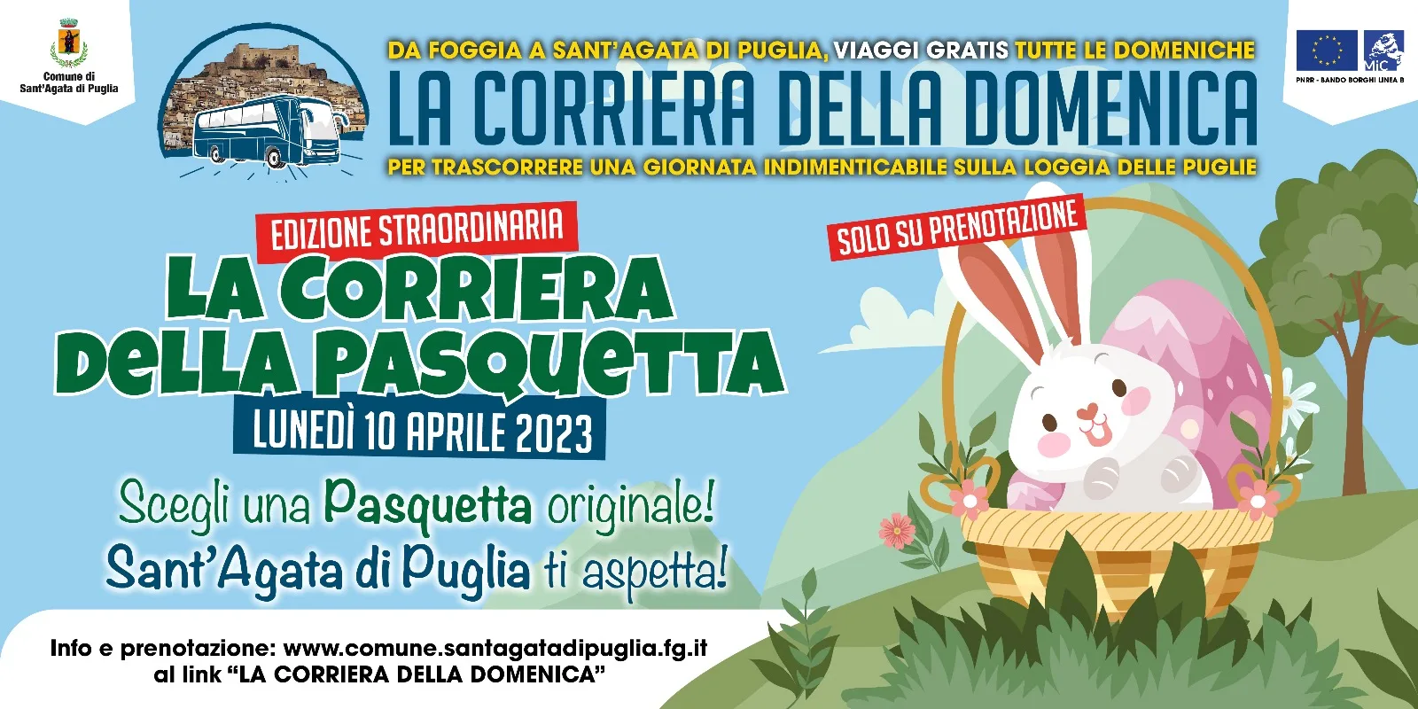 Una Pasquetta originale, diversa dalle solite gite in campagna. Il Comune di Sant’Agata di Puglia in occasione del Lunedì dell’Angelo, ripropone la “Corriera della Domenica” in versione “Corriera della Pasquetta”. Lunedì 10 aprile con partenza da Foggia alle ore 9 un comodo e confortevole bus si dirigerà alla volta di Sant’Agata per accompagnare i tanti turisti che desidereranno trascorrere una giornata indimenticabile sulla loggia delle Puglie. Il tutto rigorosamente gratis e con l’aggiunta di diversi servizi che vanno dalle visite guidate ai monumenti e ai siti storici del caratteristico borgo dei Monti Dauni, fino a flash mob in piazza e concerti con misica e balli negli angoli più suggestivi del centro storico e nel castello. La giornata inizierà alle 10 con visite guidate gratuite al c astello e alle chiese del paese, poi dalle 11,30 alle 13 tutti in piazza Municipio per il flash mob, dalle 13 alle 16 “Mangia folk” nel castello con animazione musicale e danzante all’insegna di tammuriate, pizziche e tarantelle con i gruppi Voci del Sud e Gatt ‘in’ Folk che dalle 18 alle 20,30 animeranno la serata con una serie di concerti in piazza Municipio. In caso di pioggia tutti gli eventi si svolgeranno in spazi al coperto. Per salire a bordo della “Corriera della Pasquetta” e raggiungere Sant’Agata basta prenotarsi inviando una mail al seguente indirizzo: comune.santagatadipuglia.fg@gmail.com