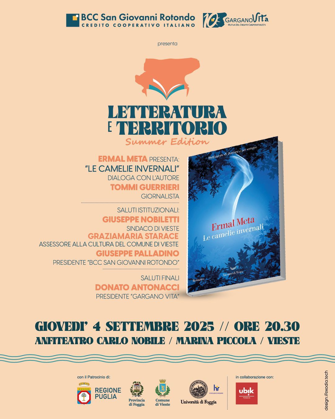 Si chiuderà a Vieste, giovedì 4 settembre 2025 alle ore 20.30, presso l’Anfiteatro Carlo Nobile di Marina Piccola, la Summer Edition della rassegna culturale “Letteratura e Territorio”, promossa dalla Banca di Credito Cooperativo di San Giovanni Rotondo e da Gargano Vita, con il patrocinio della Regione Puglia, della Provincia di Foggia, del Comune di Vieste e dell’Università degli Studi di Foggia, e la collaborazione della libreria Ubik Foggia.