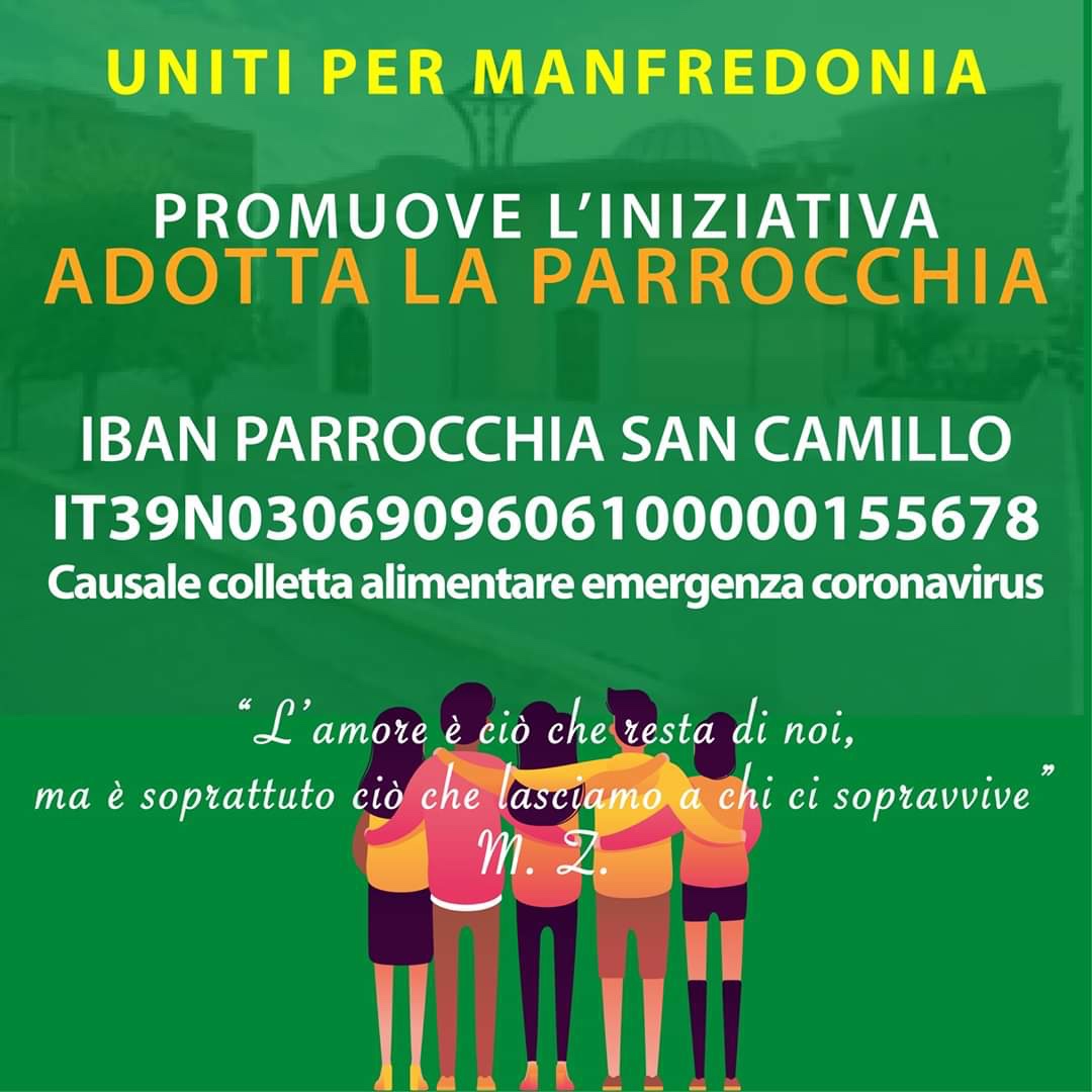 Anche la nostra pagina Uniti per Manfredonia aderisce alle varie iniziative cittadine di solidarietà verso i più bisognosi e per chi sta soffrendo a causa dell’emergenza corona virus. Per questo abbiamo deciso di intraprendere l’iniziativa “Adotta una Parrocchia” e lo abbiamo fatto in accordo con la Parrocchia San Camillo de Lellis. Tramite l’Iban messo a disposizione del suo parroco, Don Carmine Rinaldi, potete tutti quanti, in misura del tutto autonoma, contribuire al versamento di quote per far fronte alle prime necessità delle famiglie o singoli più indigenti. Un modo per dare sostegno e allo stesso tempo sollievo a chi in questo momento ha davvero bisogno. Adottare una parrocchia significa dare più forza ed un aiuto concreto, a chi da sempre si occupa di dare un conforto ai più deboli.