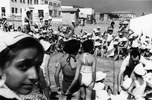 Immaginate un po’ quaranta paia di zoccoli, che musica si ascoltava, prima di fermarsi tutti a bere alla fontana giù all’esterno delle mura di cinta della complessiva abitazione di villeggiatura. Anche i costumi che avevano, gli stessi colori pure quelli, insomma erano come numerati, in un certo senso, sotto l’attento controllo delle monache, i bambini e le bambine agivano tutti alla stessa maniera e allo stesso modo, tra quelle acque verdi sembravano piccoli pesci quando vanno in branco veloci alla superficie con le testoline fuori alle onde del mare di Manfredonia, come l’inquadratura del tempo presente rappresenta gli angoli di un paese, che per anni ha lasciato sotto quella sabbia, tante storie di bambini e bambine del nostro posto, calate come ombre dietro l’orizzonte del cielo appena tornato.