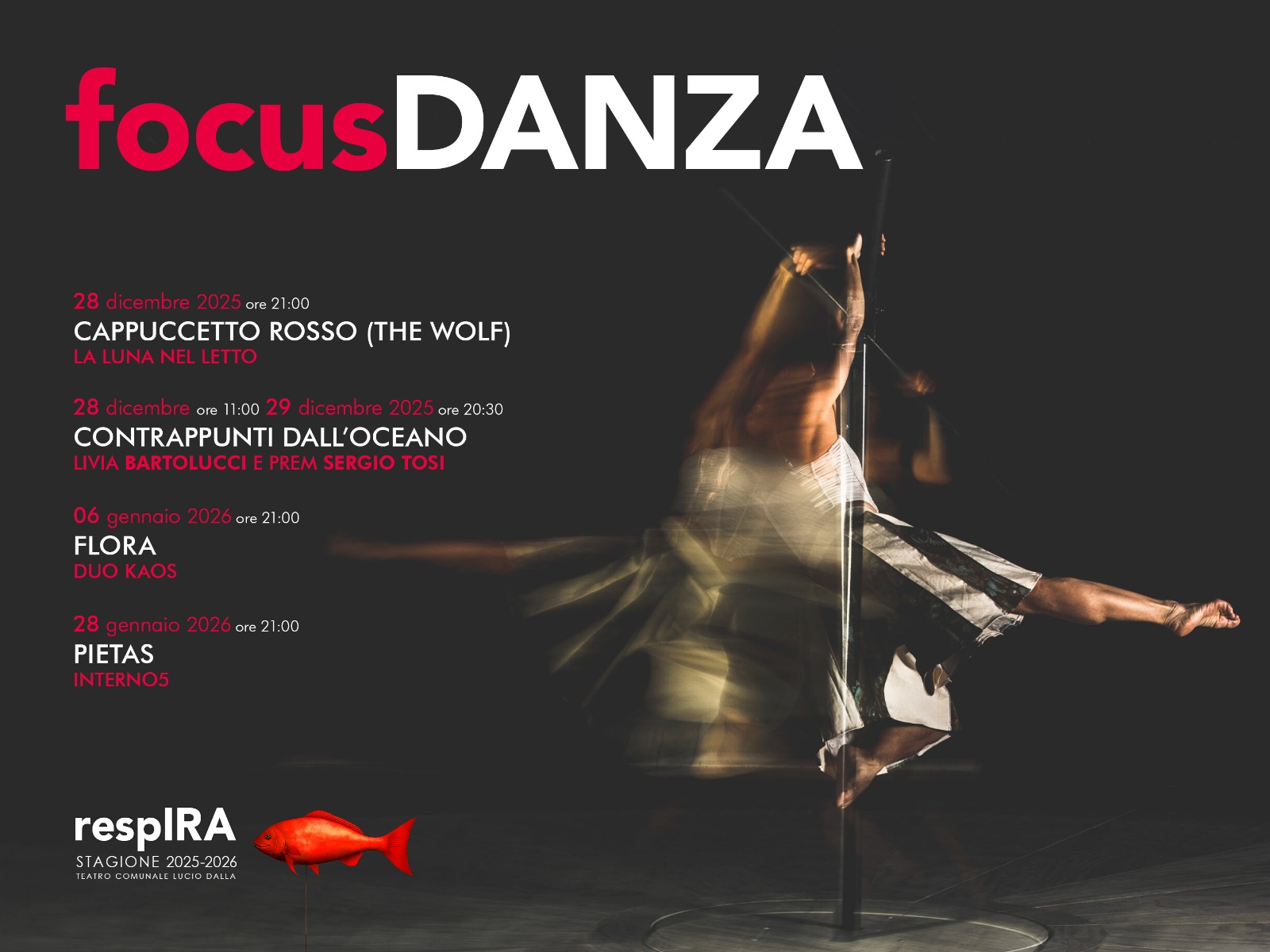 Il Teatro Comunale “Lucio Dalla” di Manfredonia conclude il vecchio anno e apre il 2026 con un momento speciale dedicato alla danza. All’interno della stagione di prosa “respIRA”, ideata e organizzata dal Comune, Puglia Culture, Bottega degli Apocrifi con il sostegno del Ministero della Cultura e della Regione Puglia, arrivano quattro appuntamenti – da fine dicembre 2025 a fine gennaio 2026 – dedicati alla danza contemporanea, al teatro danza e al circo.