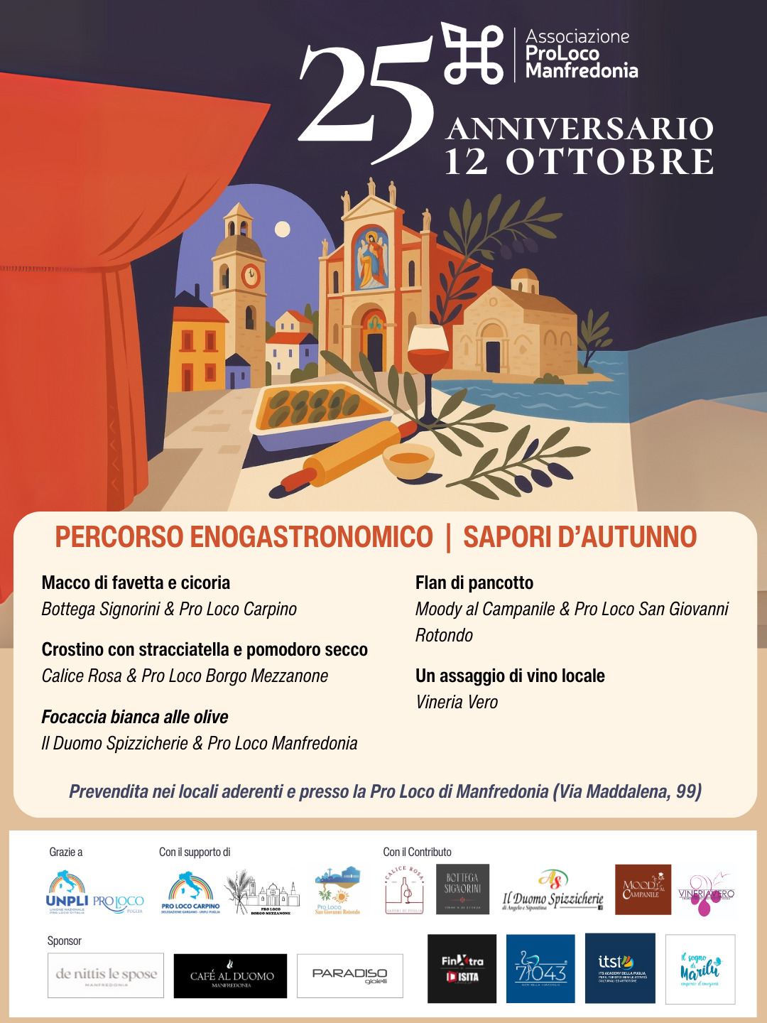 L’evento rientra nel programma della giornata celebrativa di domenica 12 ottobre, che vedrà anche momenti istituzionali, spettacoli musicali e occasioni di incontro dedicate alla città e alle sue tradizioni. Un appuntamento da non perdere per vivere insieme l’atmosfera autunnale del centro storico e festeggiare i 25 anni della Pro Loco Manfredonia con gusto e convivialità.