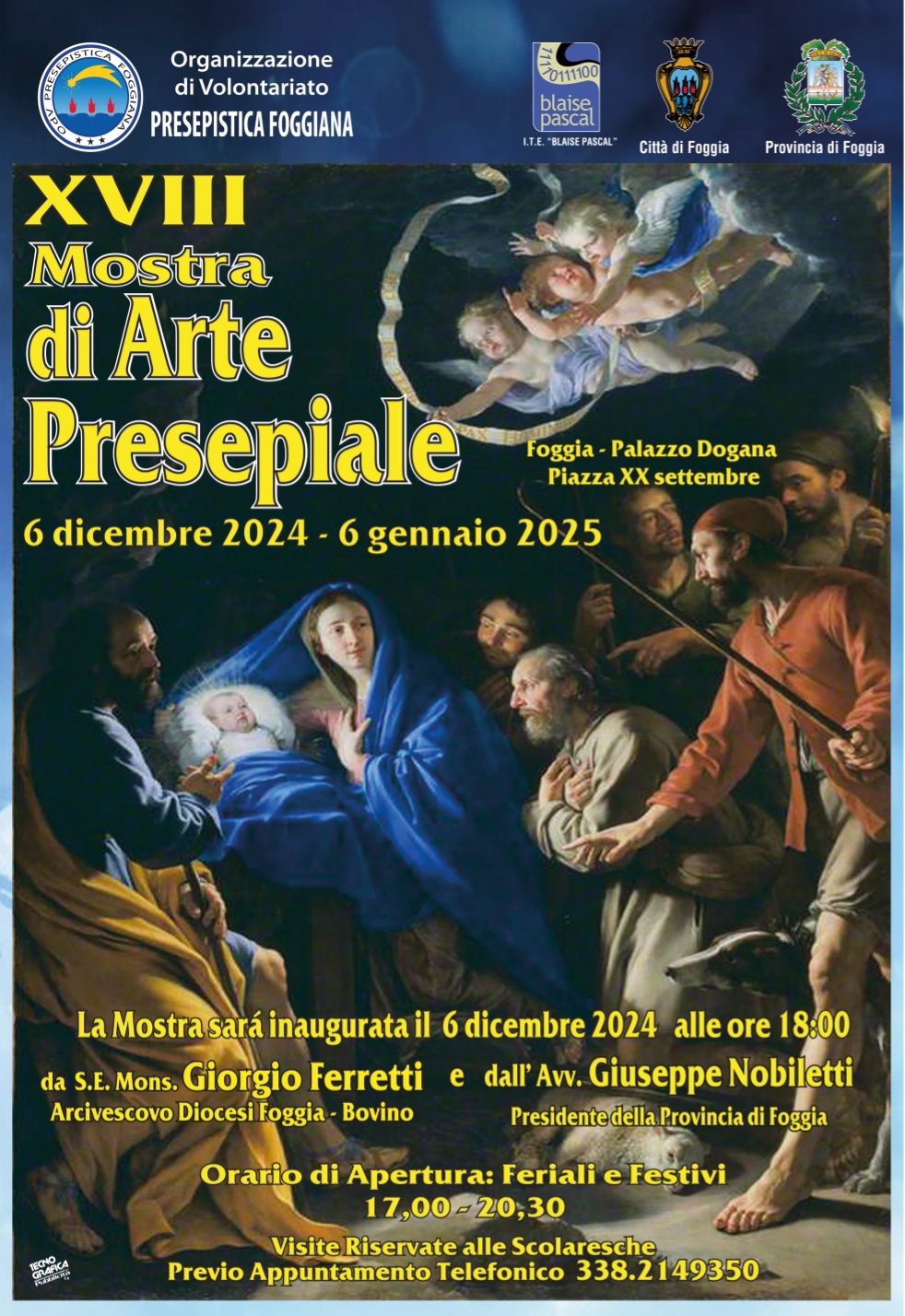 Arrivata alla sua diciottesima edizione, la Mostra di Arte Presepiale dell’Organizzazione di Volontariato (OdV) Presepistica Foggiana apre i battenti a Palazzo Dogana, in piazza XX Settembre a Foggia. A partire da venerdì 6 Dicembre 2024 e fino a lunedì 6 Gennaio 2025 saranno esposti in città i presepi realizzati dai soci e dai volontari dell’Organizzazione, dediti a diffondere la cultura e i metodi di un’arte che affonda le sue radici nel cristianesimo. A dimostrazione del forte legame dell’OdV con le Istituzioni del territorio, ad inaugurare la Mostra venerdì 6 Dicembre ore 18 ci saranno Sua Eminenza Monsignor Giorgio Ferretti, Arcivescovo dell’Arcidiocesi Foggia-Bovino e Giuseppe Nobiletti, Presidente della Provincia del capoluogo di Capitanata. È possibile ammirare le iconiche scenografie, i pastorelli e le minuterie inedite durante tutto il periodo natalizio dalle 17 alle 20:30 presso la sala multimediale sita all’interno del cortile di Palazzo Dogana, storica sede della Provincia, con ingresso libero sia nei giorni feriali che festivi.