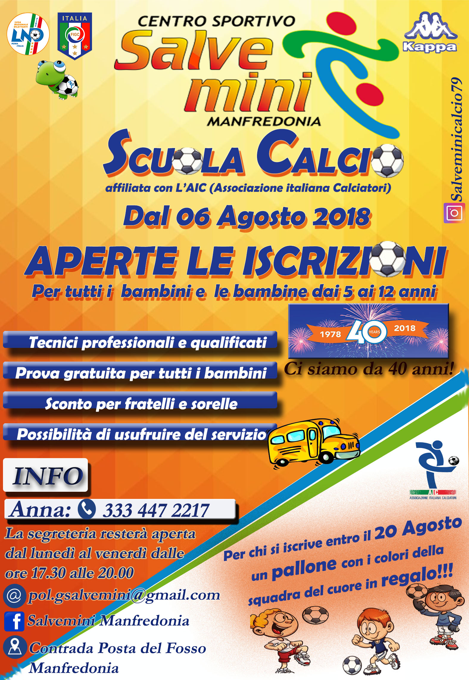 La Scuola Calcio Salvemini riparte, pronta più che mai, per proseguire il proprio iter formativo e tecnico che l’ha contraddistinta in quarant’anni di attività.