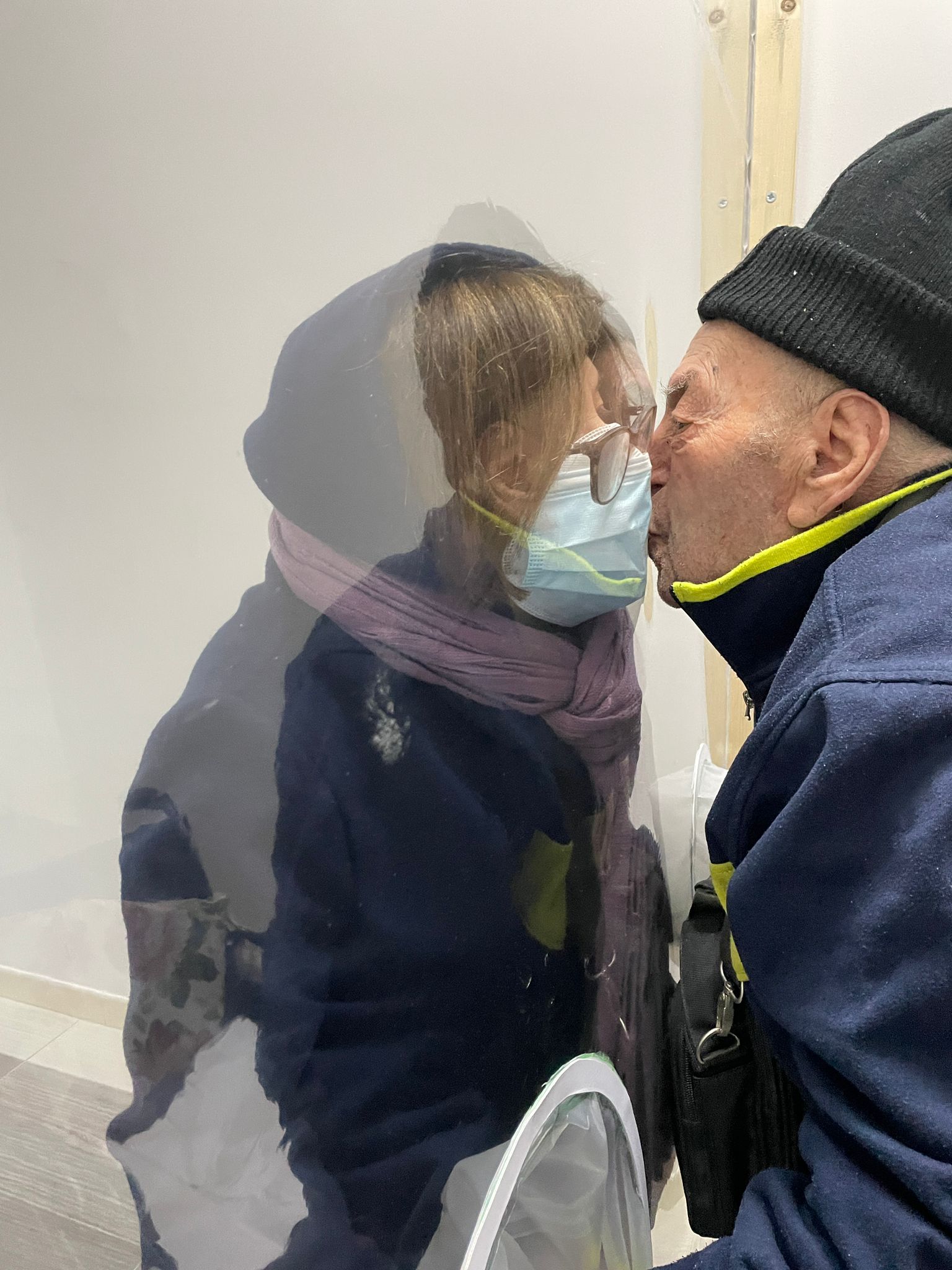 Un abbraccio significa vicinanza e gioia e consolazione e lo sa bene chi vive quotidianamente a contatto con le persone anziane; così nella RSSA Madre Teresa ci si è tornati ad incontrare attraverso un divisorio di plastica trasparente, dotato di specifici manicotti fissi in cui infilare le braccia, per stringersi o per scambiarsi carezze. Le postazioni allestite sono divise da barriere per garantire privacy e sicurezza, con continuo ricambio d’aria e igienizzazione degli ambienti.