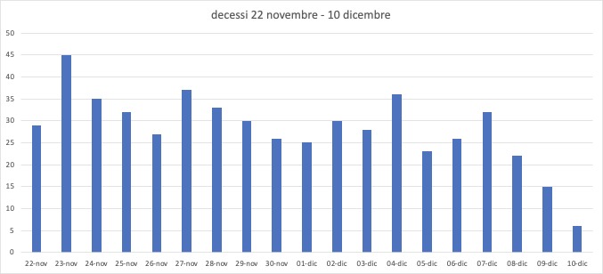 Dichiarazione dell’assessore alle Politiche della Salute, prof. Pier Luigi Lopalco: “I decessi riportati nel bollettino odierno non rispecchiano l’andamento giornaliero che vede un picco settimanale di 36 decessi (vedi grafico allegato) lo scorso 4 dicembre. Si ricorda infatti che il bollettino quotidiano riporta solo quanto immesso nel sistema quel giorno e non la data dell’evento”.