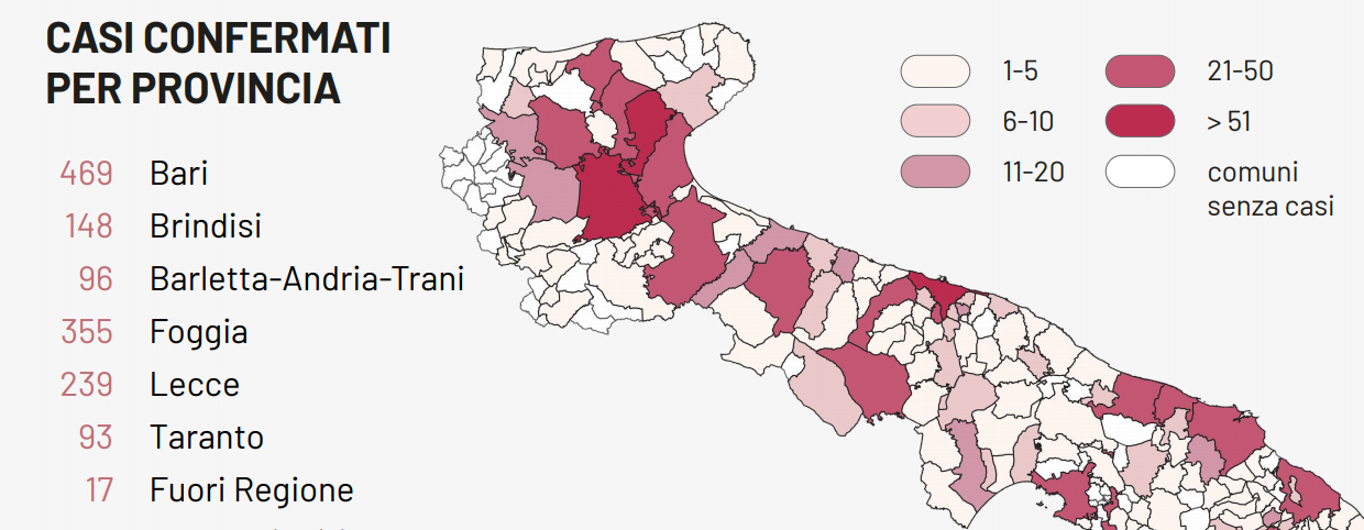 Il totale dei casi positivi Covid in Puglia è di 1.458, così divisi: