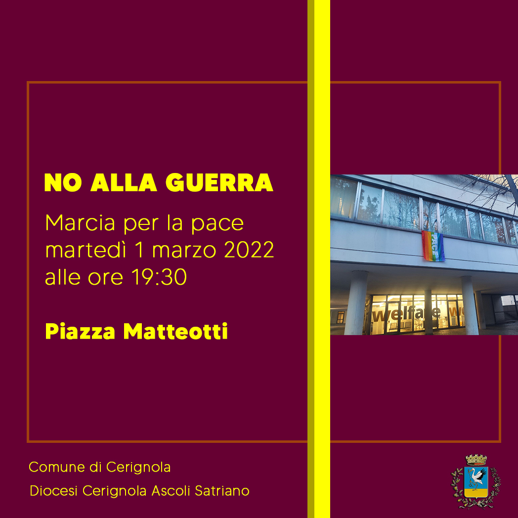 Un corteo della pace per dire no alla guerra in Ucraina e ribadire la contrarietà a tutti i conflitti e ad ogni tipo di violenza. L’Amministrazione Comunale di Cerignola, insieme alla Diocesi, organizza l’iniziativa per martedì 1 marzo, alle ore 19:30, in Piazza Matteotti. Il Comune di Cerignola, che ha già esposto la bandiera della pace sulla facciata di Palazzo di Città, si fa promotore dell’incontro con l’aiuto della Chiesa, delle forze politiche, delle associazioni, della società civile.