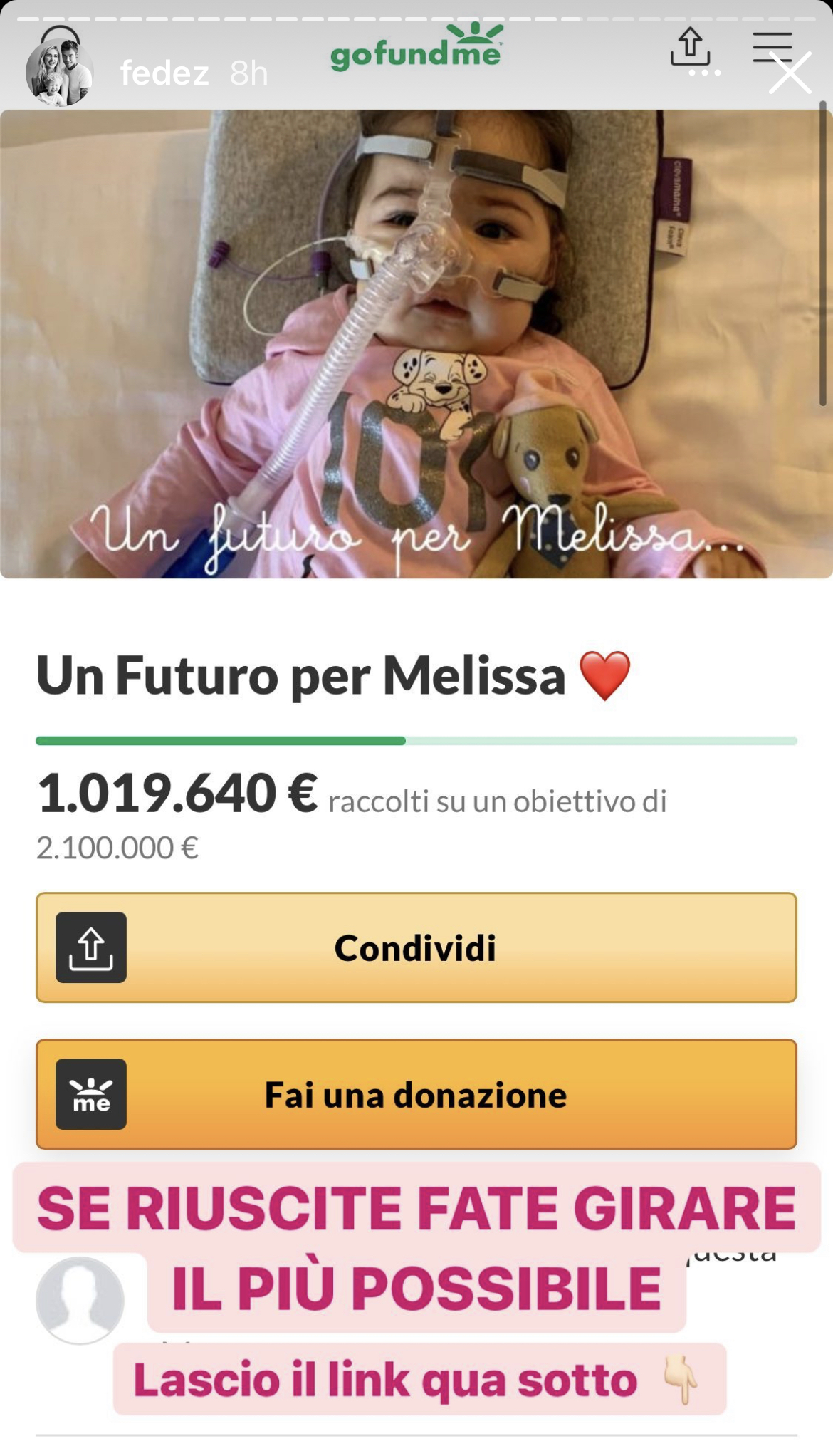 Anche Fedez condivide la raccolta fondi per Melissa la piccola Pugliese che ha bisogno di cure.