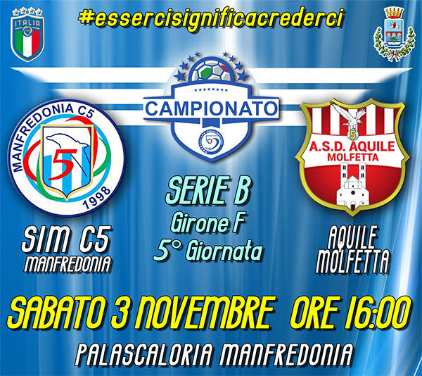 Per la 5° giornata di Serie B la SIM c5 Manfredonia affronterà una delle avversarie più temibili del girone F: l’Aquile Molfetta. I ragazzi di Mister Monsignori hanno già incontrato i biancorossi, nella partita di Coppa Italia del 29 Settembre. La compagine di Mister Rutigliani riuscì a vincere di misura per 5 a 4 in una bella partita. Ora si torna in campo, ma in questo caso ci sono in palio i tre punti per scalare la classifica.
