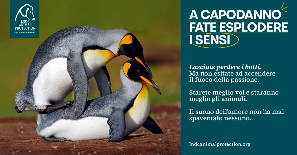 “Quest’anno abbiamo deciso di lanciare un messaggio diverso, forse un po’ provocatorio ma senza dubbio inattaccabile. Siamo circondati da guerre e distruzione, per questo chiediamo che almeno il Natale e il Capodanno siano momenti di pace e tranquillità per tutti. I botti ricordano in modo inquietante le esplosioni delle guerre e spesso danno anche risultati quasi altrettanto fatali. Ecco perché invitiamo tutti a lasciare da parte queste usanze e a far esplodere i sensi, anziché i petardi, un po’ sulla scia del “fate l’amore, non fate la guerra” degli anni ’60. Dedichiamoci di più a ciò che è bello e sano, prendiamoci cura di noi e degli altri. Così potremo davvero dire di aver onorato le feste”, dichiara Piera Rosati – Presidente LNDC Animal Protection.