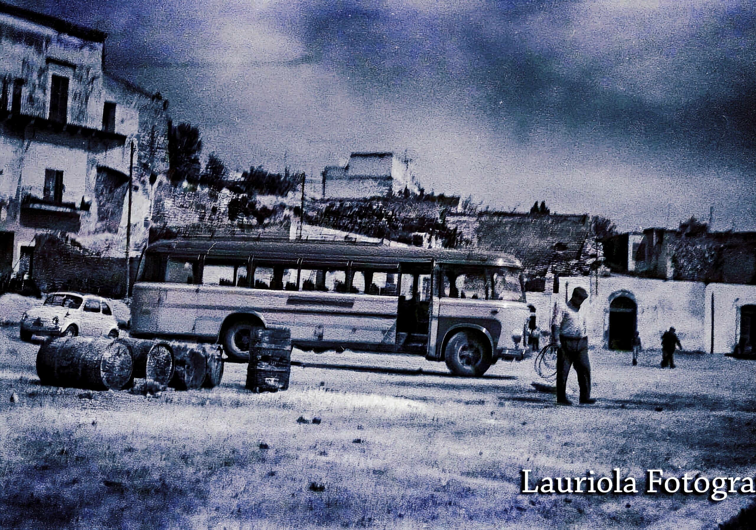 GUARDO il Largo Diomede – Manfredonia attraverso un’immagine mistica tra cielo e mare, di terra polverosa con avvallamenti – colta nell’aria molto unica e sempre nebbiosa, della quasi primavera, in un pomeriggio di silenzio,osservo attentamente le nuvole di grazie di una rinascita tutt’uno alla superficie dell’acqua stesa come un’anima colma di tranquillità come una giornata di una serena stanchezza buona. Questo chiarisce che la nostra città sotto le onde è viva, e porta su tutta la sua energia di sopravvivenza a voler far continuare la sua storia in una “parola” che sia la nostra. Luogo importante tra lavori e mestieri e vita di tutti i giorni . Nella foto appare l’autobus di linea – delle famiglie Palumbo – Fusilli tratta per Zapponeta , parcheggiata nel piazzale … In un’ora che portava i turisti lungo il viale – quando da ogni parte arrivavano nel nostro territorio.