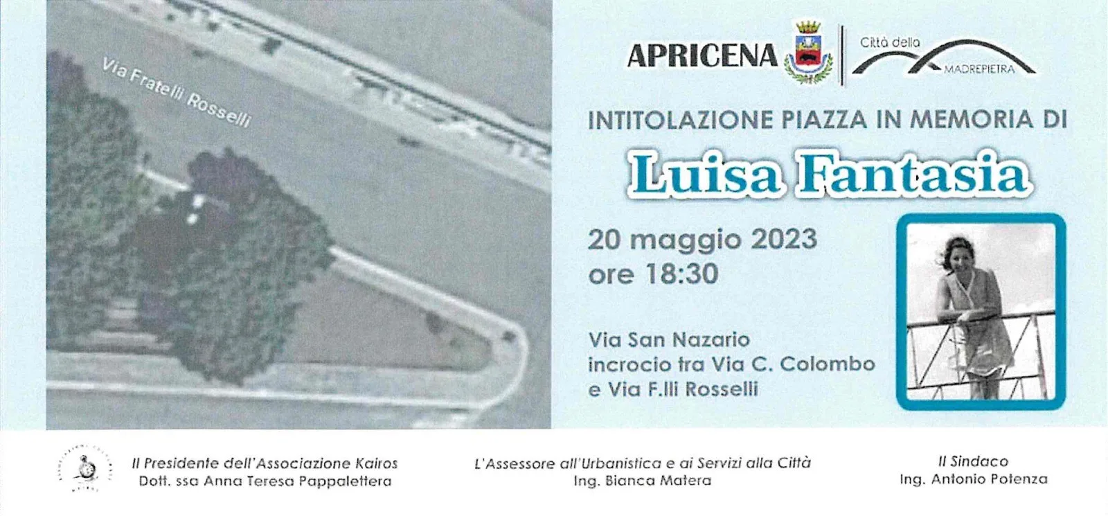 Come già annunciato nel mese di gennaio, la Città di Apricena ospiterà una Piazza alla memoria di Luisa Fantasia, donna, moglie, madre e vittima innocente di mafia, uccisa a Milano il 14 giugno del 1975, per il suo impegno contro la mafia portato avanti insieme al marito Antonio Mascione, Brigadiere al Comando Provinciale di Milano.