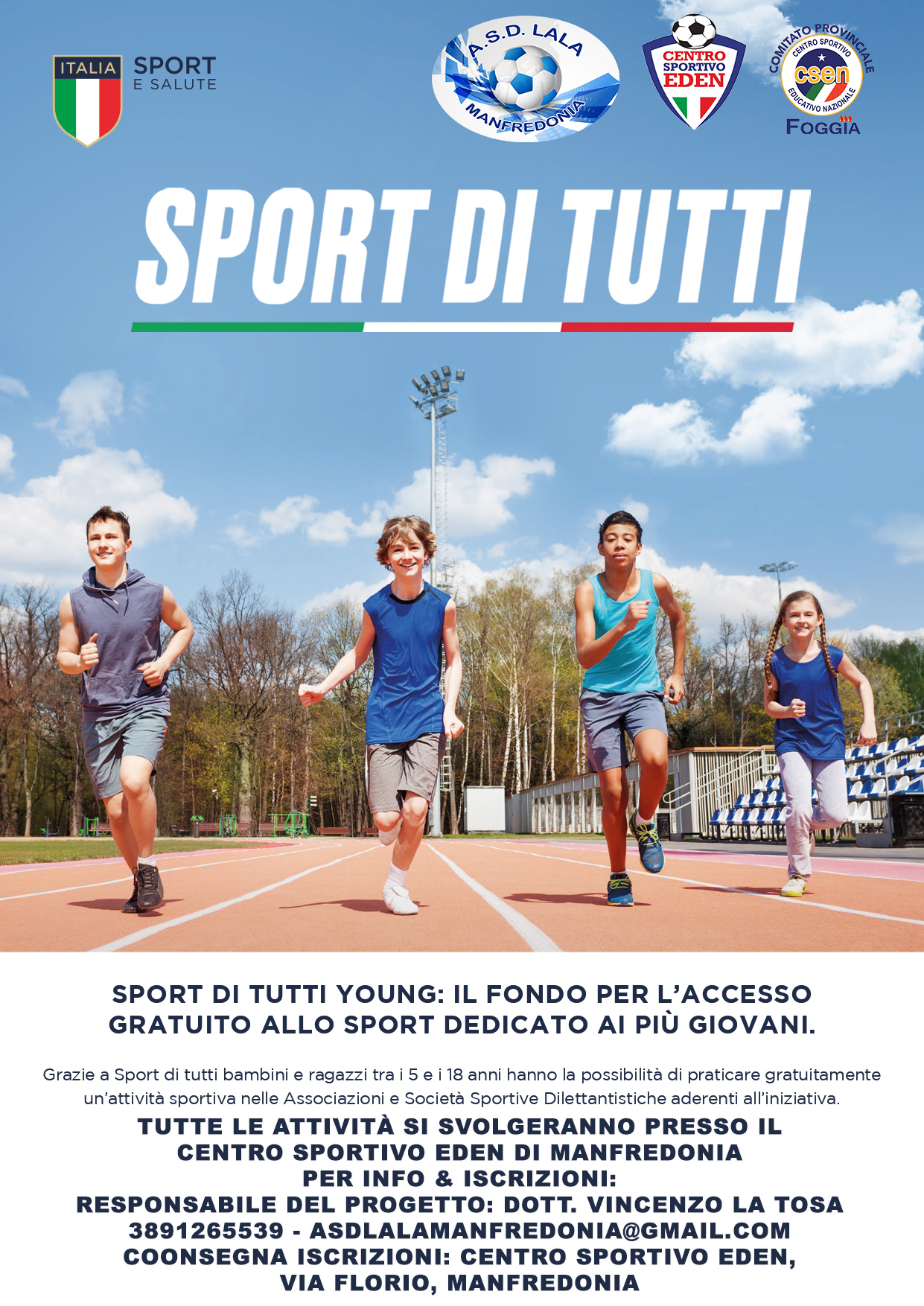 L’asd LALA Manfredonia è lieta di comunicare l’inizio del progetto sport di Tutti a Manfredonia. Il progetto prevede di far partecipare ad attività sportive gratuite tutti i ragazzi dai 5 ai 18 anni.
