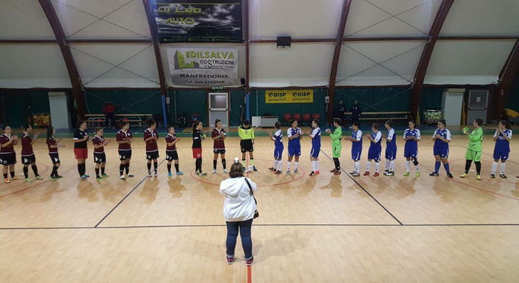Pari e patta tra le ragazze dell’ASD Manfredonia 2000 e le pari età dell’Uniti per Cerignola nella 2° giornata di coppa Puglia gir. A, che qualifica matematicamente le biancoazzurre al turno successivo. Al PalaTomaiuolo, nella prima frazione di gioco, le sipontine dopo i primi iniziali minuti di studio passano in vantaggio al 7’con Simona Maccione che sfrutta al meglio l’assist di Giovanna Palumbo scaricando un destro perentorio all’incrocio, trafiggendo il portiere cerignolano ofantino Sciannamea. L’iniziale vantaggio viene legittimato da una serie di ulteriori palle gol con Antonella Castriotta (diagonale fuori di poco), e Raffaella Bosco anticipata in extremis al momento del tiro dopo una grande azione corale. Supremazia territoriale evidente delle locali che concedono solo tiri dalla distanza a Guercia e company ma che trovano la sempre vigile Elisabetta Palumbo. Dopo aver subito per i primi 20 min, le ofantine prendono le misure, alzano la squadra e le nostre calano un po’ di attenzione, perdendo mobilità e distanza tra i reparti. E.Palumbo è miracolosa al 24’ quando frena Guercia sola davanti alla porta e salva il risultato. Nei minuti finali della prima frazione, le cerignolane vanno vicine al pareggio con una bella triangolazione di poco a lato e con un grande tiro dalla distanza di Di Lucia. Nonostante la sofferenza degli ultimi minuti di tempo l’Asd Manfredonia 2000 va in riposo in vantaggio 1-0. Martino Portovenero fa sentire la propria voce, non soddisfatto dell’atteggiamento della compagine biancoazzurra e per dare una scossa alle sue ragazze. Si rientra in campo agli ordini del direttore di gara sig. Peschechera. Nel secondo tempo si assiste a una partita vibrante, con le ospiti alla ricerca del pareggio e le locali del raddoppio. Ripetuti capovolgimenti di fronte provocano diverse azioni da gol di Guercia, Dellatte, Rita Ciociola, Simona Maccione. L’azione più nitida è però di Francesca Longo,che autrice di una splendida azione personale, anticipa l’estremo ofantino al 19’ con una puntata, cogliendo in pieno il palo e strozzando l’urlo del gol agli spettatori sugli spalti. La squadra granata prende fiducia e con la fisicità e le buone sponde di Vanessa Tanzi, sfiora ancora due volte il raddoppio con Palumbo e Longo. Quando tutto lascia presagire che la partita sia in controllo, giunge inaspettamente il pareggio ospite con Guercia, che riprende una respinta di Francesca Placentino e scaraventa in porta la palla del pareggio, tra l’esultanza dei tifosi cerignolani.