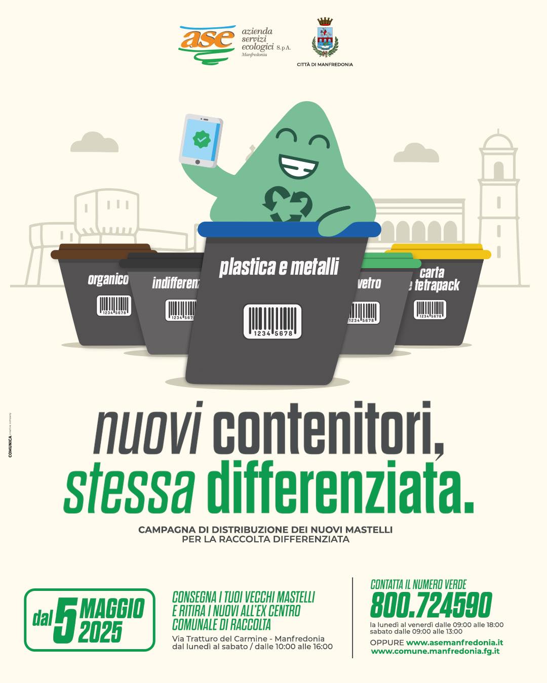 “L’introduzione dei nuovi mastelli – aggiunge l’Assessora all’Ambiente Rita Valentino – è solo il primo passo di un percorso più ampio che stiamo portando avanti per costruire una Manfredonia più pulita, ordinata e attenta all’ambiente. La tariffazione puntuale premia chi si impegna nella raccolta differenziata: meno rifiuti produci, meno paghi. È un principio di equità e responsabilità che vogliamo condividere con tutti i cittadini.”