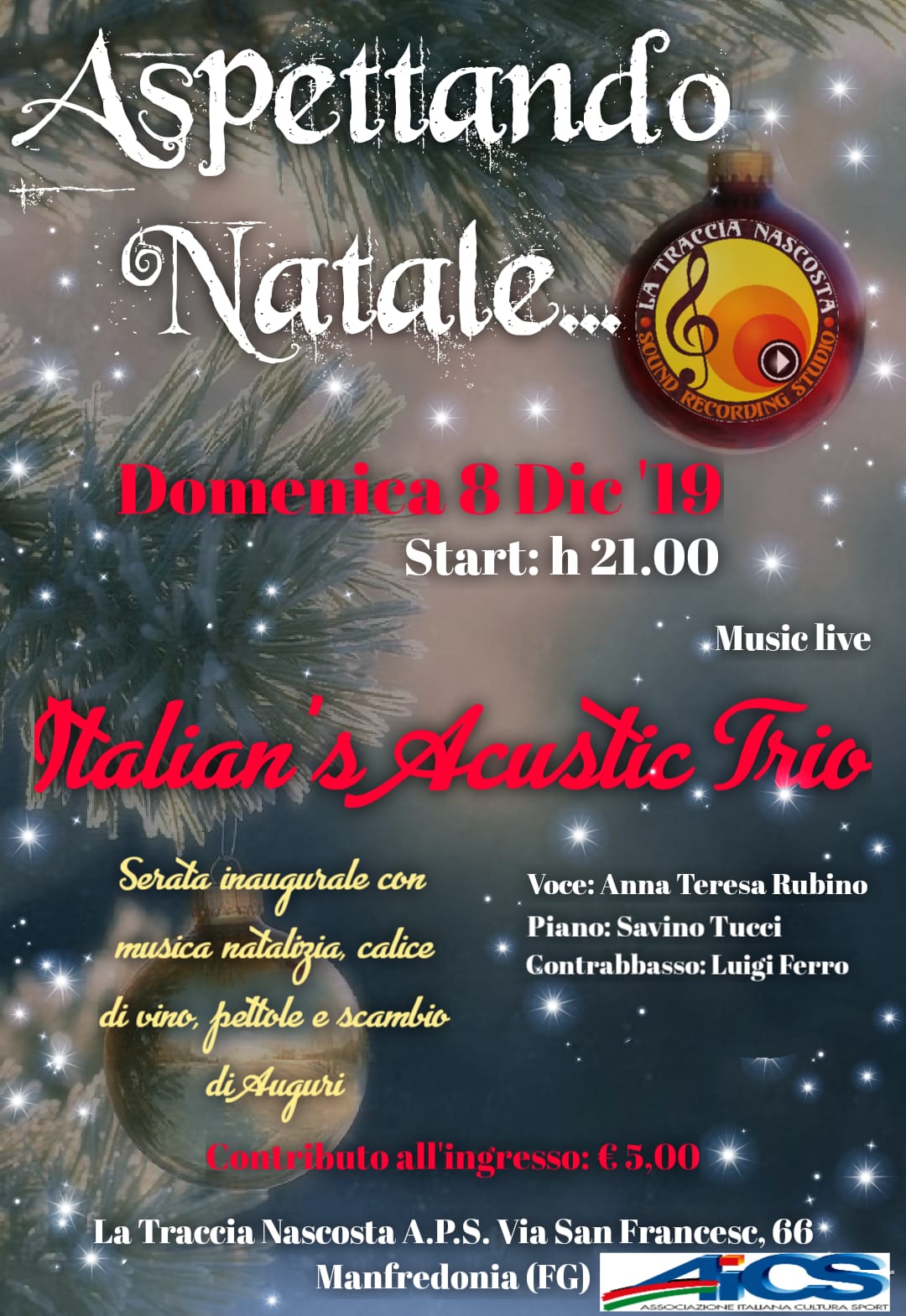Da tradizione in questa data ci si cala ufficialmente nella atmosfera natalizia e nella corsa ai regali. Ma nell’attesa regalatevi un momento per voi, in un’atmosfera di luci musica e profumi con la musica degli Italian’s Acustic trio, un calice di vino e l’immancabile pettola. ITALIAN’S ACUSTIC TRIO Voce: Anna Teresa Rubino Piano: Savino Tucci Contrabasso: Luigi Ferro Contributo all’ingresso € 5,00 (cinque euro) Serata inaugurale e presentazione -Tessera Gold – con scambio di auguri e uno sguardo ai prossimi eventi in programma.