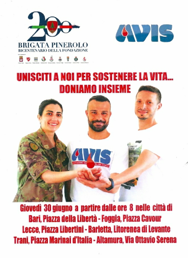 La Brigata Pinerolo compie 200 anni e ha scelto di celebrare l’evento con un’iniziativa dedicata alla cultura della donazione del sangue, per il sostegno delle persone che ne hanno la necessità. Grazie all’intesa tra Esercito e AVIS Puglia, il 30 giugno, militari e volontari potranno donare il sangue nelle autoemoteche allestite in 6 piazze pugliesi (Bari, Trani, Lecce, Altamura, Barletta, Foggia).