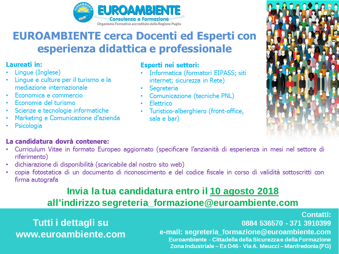 L’Organismo Formativo Euroambiente s.r.l.  intende acquisire dichiarazioni di disponibilità per i seguenti profili:  Docenti ed Esperti entrambi con esperienza didattica e professionale.