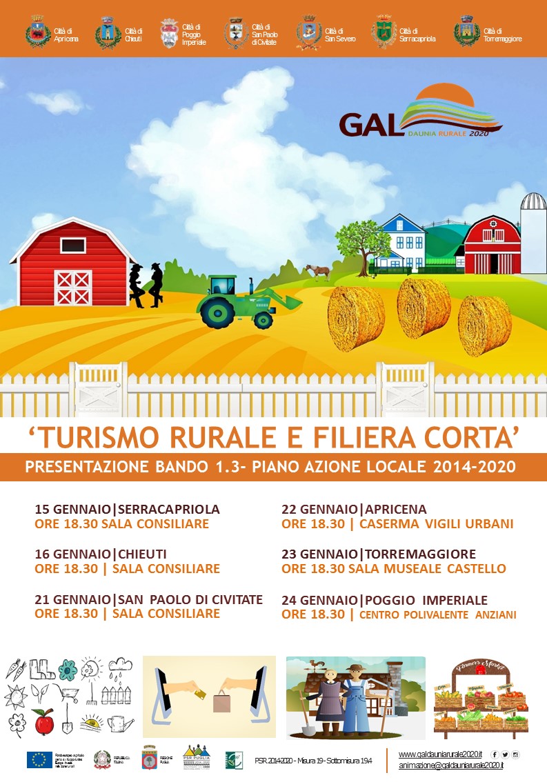 Dal 15 al 24 gennaio il GAL Daunia Rurale 2020 presenterà nei suoi Comuni il bando relativo all’intervento 1.3 “Sviluppo innovativo della commercializzazione integrata di prodotti/servizi nelle aziende agricole di filiera corta” che premiala progettualità integrata delle aziende agricole nell’ambito del turismo rurale e della valorizzazione della produzione tipica, oltre a mettere in sinergia le diverse potenzialità e risorse produttive, così da contribuire a creare una rete di aziende multifunzionali operanti all’interno del FoodDistrict della Daunia Rurale.