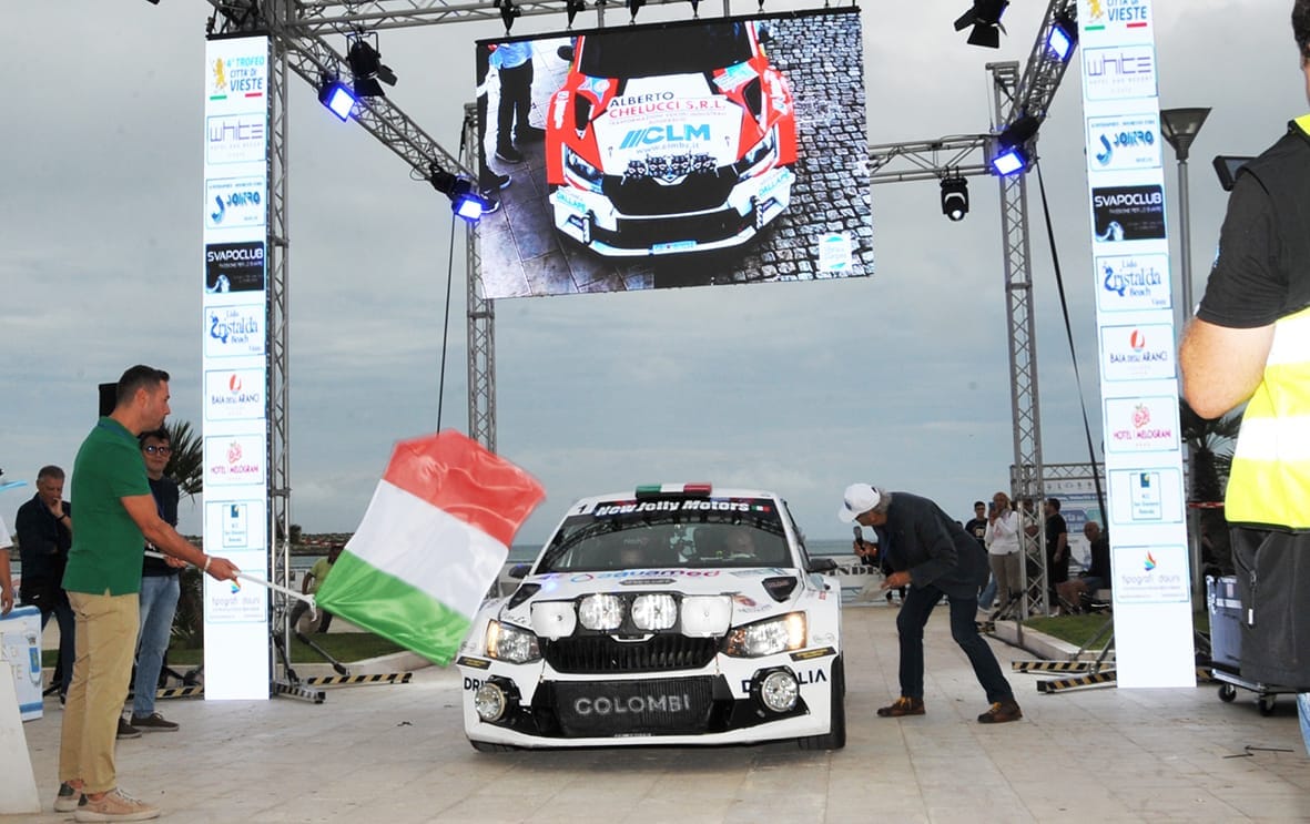 Partenza spettacolare a Vieste, ieri per il 14. Rally Porta del Gargano – 4. Trofeo Città di Vieste. A Marina Piccola, tra le luci e i led wall dell’area di partenza, nello sfondo delle costruzioni antiche della città garganica, l’Assessore Gaetano Desimio ha sventolato la bandiera tricolore davanti alla Skoda Fabia R5 di Giuseppe Bergantino e Mirko Di Vincenzo (nella foto sopra), partiti con il numero 1 in qualità di vincitori della precedente edizione. Con l’intenzione di assicurarsi la loro decima vittoria in questa gara, l’equipaggio di Manfredonia si è lanciato subito all’attacco: sulle strade dei Comuni di Peschici e Vico Del Gargano, dove si sono svolte le prime quattro prove speciali, Bergantino è stato costantemente autore del miglior tempo