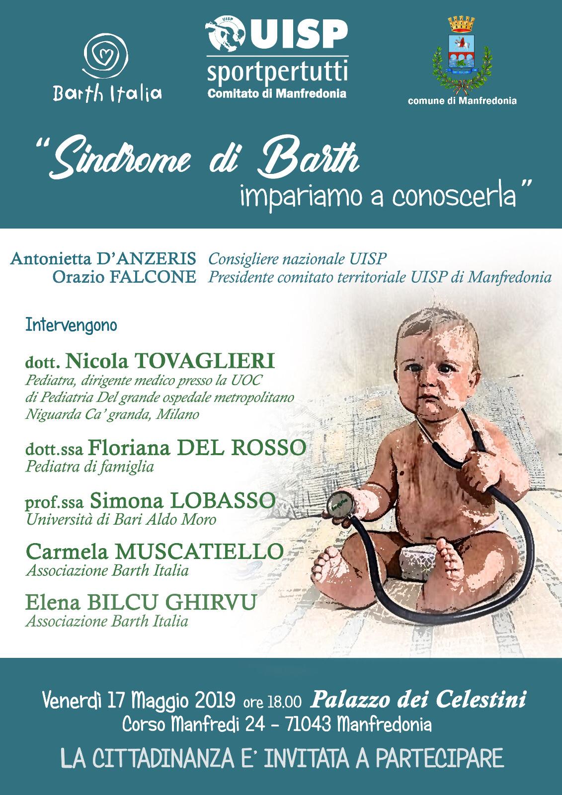 La migliore testimonianza di questa partnership solidale è il convegno che si terrà il prossimo venerdì 17 maggio alle ore 18 circa presso l’Auditorium Cristanziano Serricchio di Palazzo dei Celestino.  Alla conferenza, dal titolo “Sindrome di Barth, impariamo a conoscerla” presieduta da Antonietta D’Anzeris, Consigliere Nazionale Uisp, e dal presidente del Comitato Territoriale Orazio Falcone, interverranno: il dott. Nicola Tovaglieri (pediatra, dirigente medico presso la UOC di Pediatria del Grande Ospedale Metropolitano Niguarda Cà Grande di Milano), la dott. ssa Floriana Del Rosso (Pediatra di famiglia), la prof. ssa Simona Lobasso dell’Università di Bari, Carmela Muscatiello e Elena Bilcu Ghirvu dell’Associazione Barth Italia.