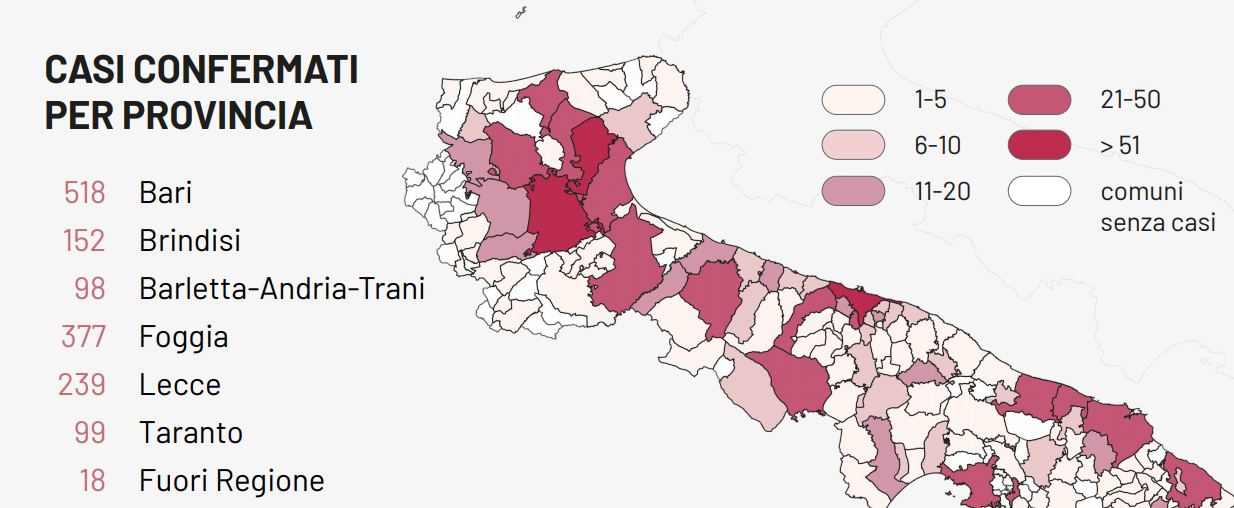 Il totale dei casi positivi Covid in Puglia è di 1.549, così divisi: