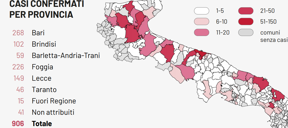 Il totale dei casi positivi Covid in Puglia è di 906, così divisi: