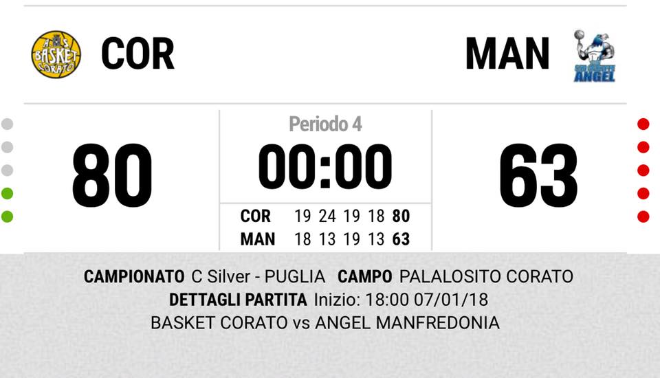 Pronti via e nel secondo quarto Corato va sul 32 – 20, Castoro (15) e Morresi (18) bruciano la retina dalla lunga distanza, armati dalle sapienti mani del capitano Stella (10p, 10a). Alla Silac non bastano i canestri di Padalino A. (10). Il divario tra i due quintetti si amplia con il trascorrere dei minuti (33-18 al 17’), grazie alla precisione al tiro dalla lunga e media distanza dei padroni di casa e la solida difesa del duo Bagdonavicius e Cicivè (11p, 18r.). Si va negli spogliatoi sul 43 – 31. Nel terzo e quarto periodo, Corato amministra sapientemente il vantaggio senza correre alcun rischio, e la Silac ci mette l’anima nel recuperare palloni, ma la poca lucidità in attacco produce altrettante palle perse. Con i parziali di 19 – 19 e 18 – 13, alla sirena finale il tabellone indica il punteggio di 80 – 63 per i padroni di casa.