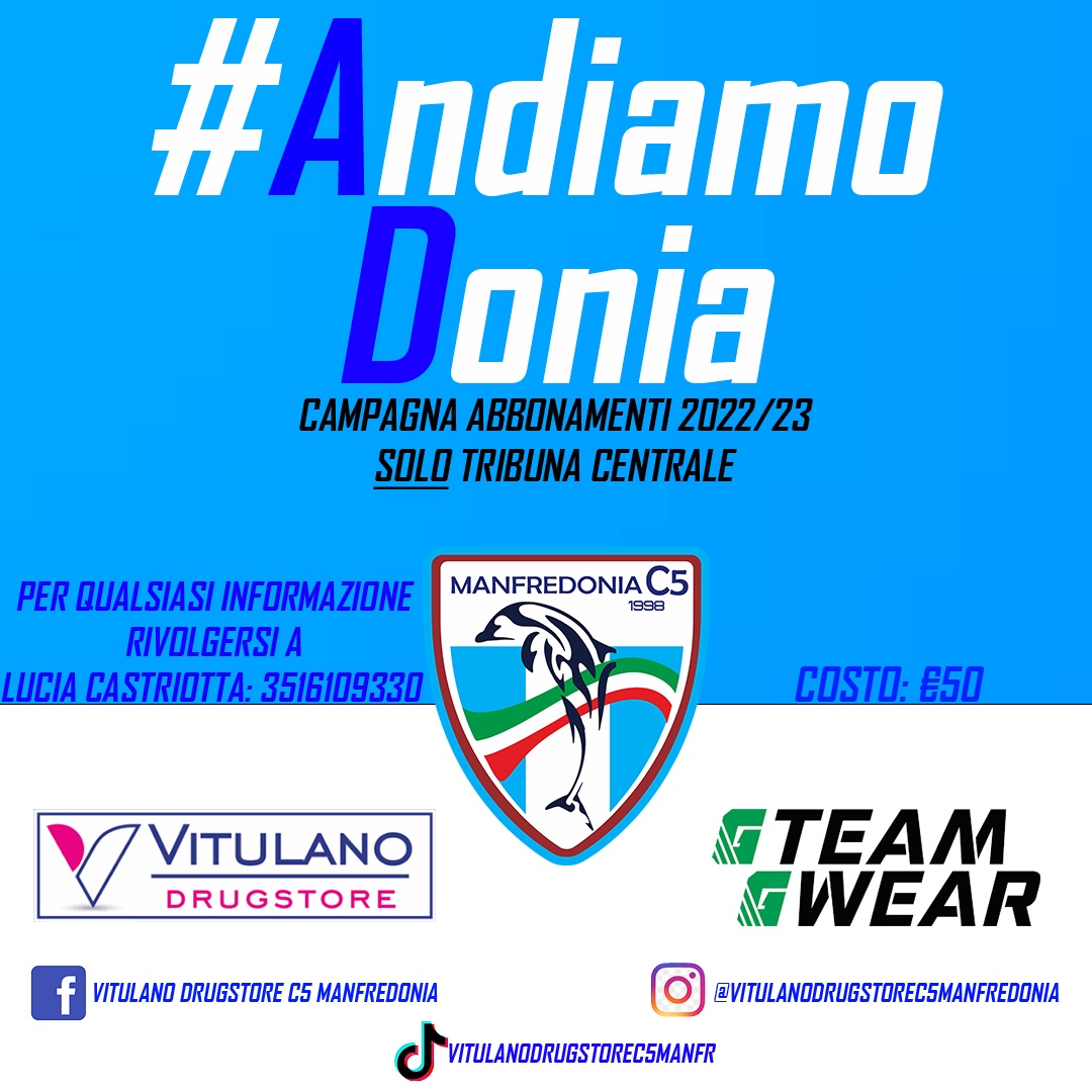 In vista della prima partita casalinga, sabato 1 ottobre al PalaScaloria di Manfredonia contro il Gear Siaz Piazza Armerina, il Vitulano Drugstore C5 Manfredonia comincia la sua campagna abbonamenti per la stagione 2022/23, riservata esclusivamente alla tribuna centrale del palazzetto.