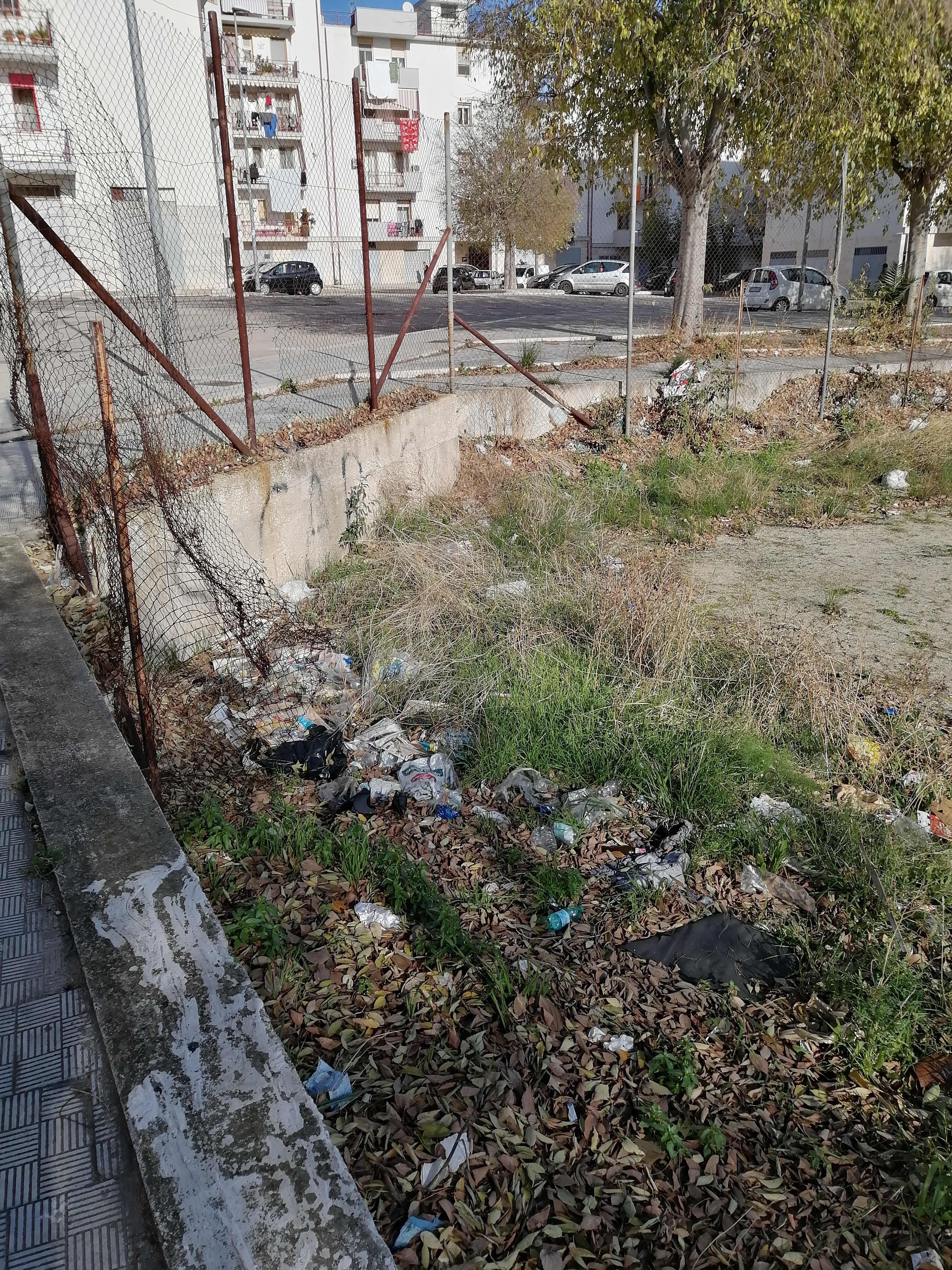 Il campetto di calcio adiacente la chiesa di San Carlo Borromeo in Manfredonia, è in totale stato di abbandono, recinzione in rete metallica divelta e in parte distrutta, erbaccia che si è impossessata quasi di tutto il campo, sacchetti di immondizia che vengono abbandonati e rifiuti che si accumulano proprio all’interno dell’area.