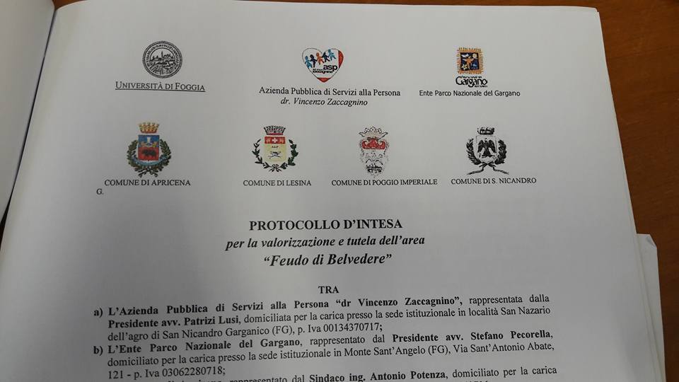 Oggi, pressol’Asp Zaccagnino di San Nicandro Garganico (azienda proprietaria dei terreni) è stato siglato il protocollo d’intesa per l’avvio della procedura di candidatura. A firmare la presidente dell’Asp Patrizia Lusi, il presidente del Parco Nazionale del Gargano Stefano Pecorella e i rappresentantidelle quattro amministrazioni coinvolte: Anna Maria Torelli per il Comune di Apricena, Antonio Lombardiper Lesina, Alessandro Buzzerioper Poggio Imperiale e Domenico Fallucchiper San Nicandro Garganico. All’incontro hanno partecipato anche il professor Massimo Monteleone del dipartimento di Agraria dell’Università degli studi di Foggia e l’archeologo Feliciano Stoico che faranno parte del tavolo tecnico.