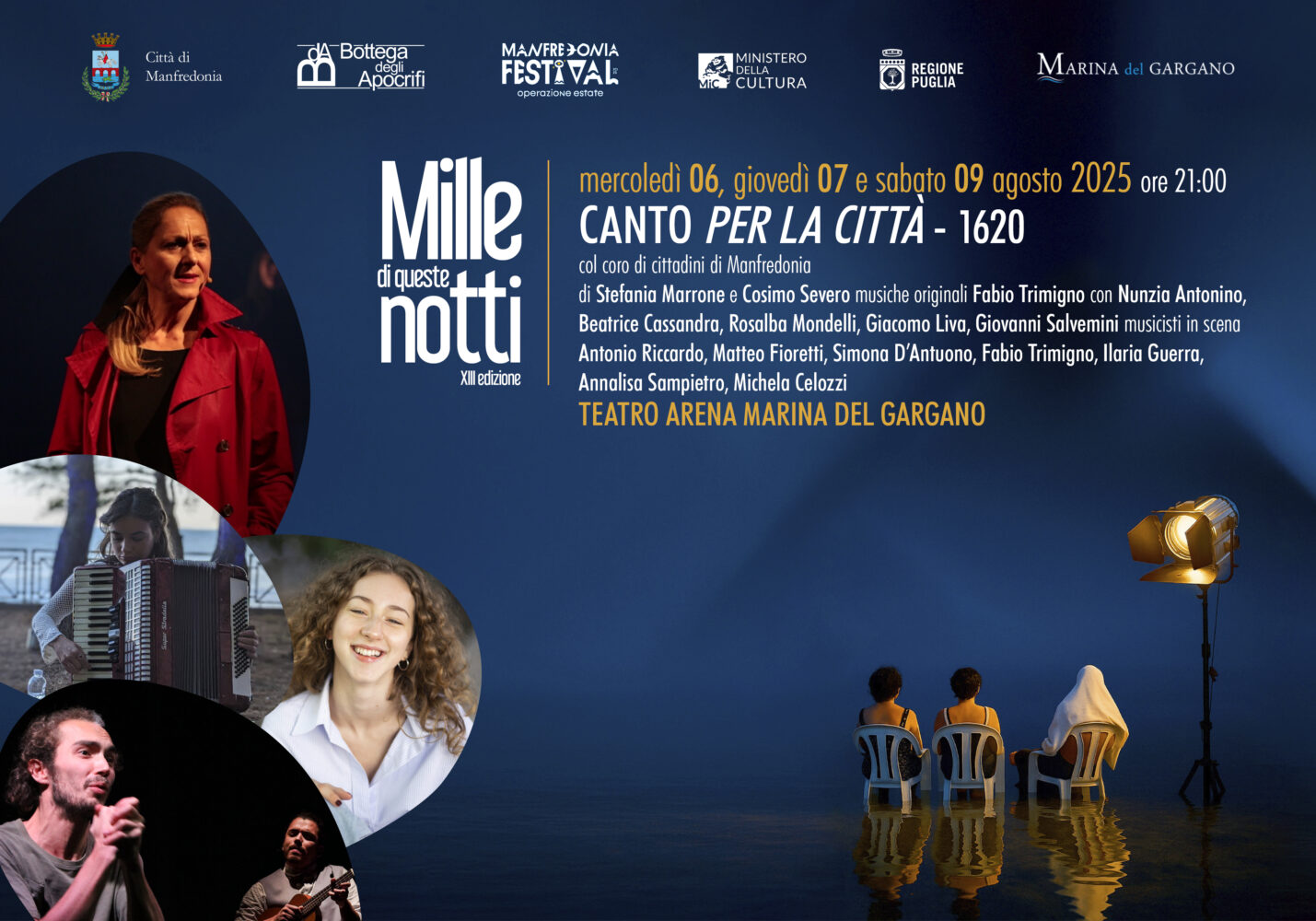 L’evento sarà realizzato in esclusiva nelle sere del 6, 7 e 9 agosto, per la rassegna “Mille di queste notti” ideata e realizzata all’interno del Manfredonia Festival da Bottega degli Apocrifi e dal Comune di Manfredonia, col supporto di Marina del Gargano, che ospiterà lo spettacolo nel Teatro Arena del Porto Turistico.